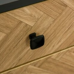 - Bold light-dark contrast, unique herringbone pattern, elegant tapered feet and square hardware accents fit most modern or traditional setting