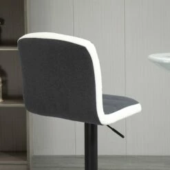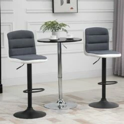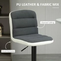 Accent your kitchen counter or seat a guest with this bar stool set. The mid-size back and footrest provides high seating comfort, while the seat height is adjustable to suit different statures. PU leather and linen-touch polyester fabric mix add textual interest.
