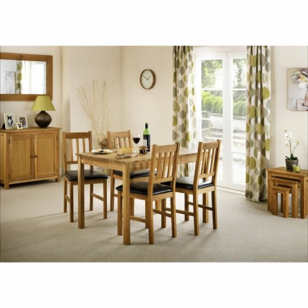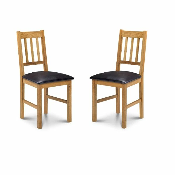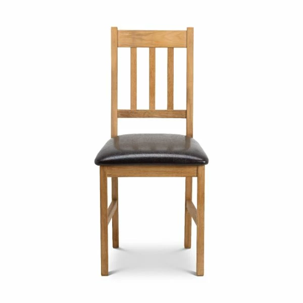 Coxmoor chairs, crafted from solid oak, with a durable oil finish and faux brown leather seats, matching almost any d├®cor. This classic, timeless design adds extra comfort for you to enjoy your daily meals.