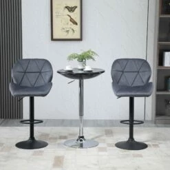 - Dreaming of a more luxurious home? Awaken to these two bar stools from HOMCOM. Design blends moulded seats with velvet-feel upholstery for sophistication. There’s triangle-panelling all over for a slightly retro feel and sponge padding for comfort. Each seat is fixed firmly onto a round metal base to keep the balance. It’s finished with a low bar to rest your legs and feet. Whether dining higher or lower, these breakfast bar stools will provide the glamorous backdrop you’ve been yearning for.