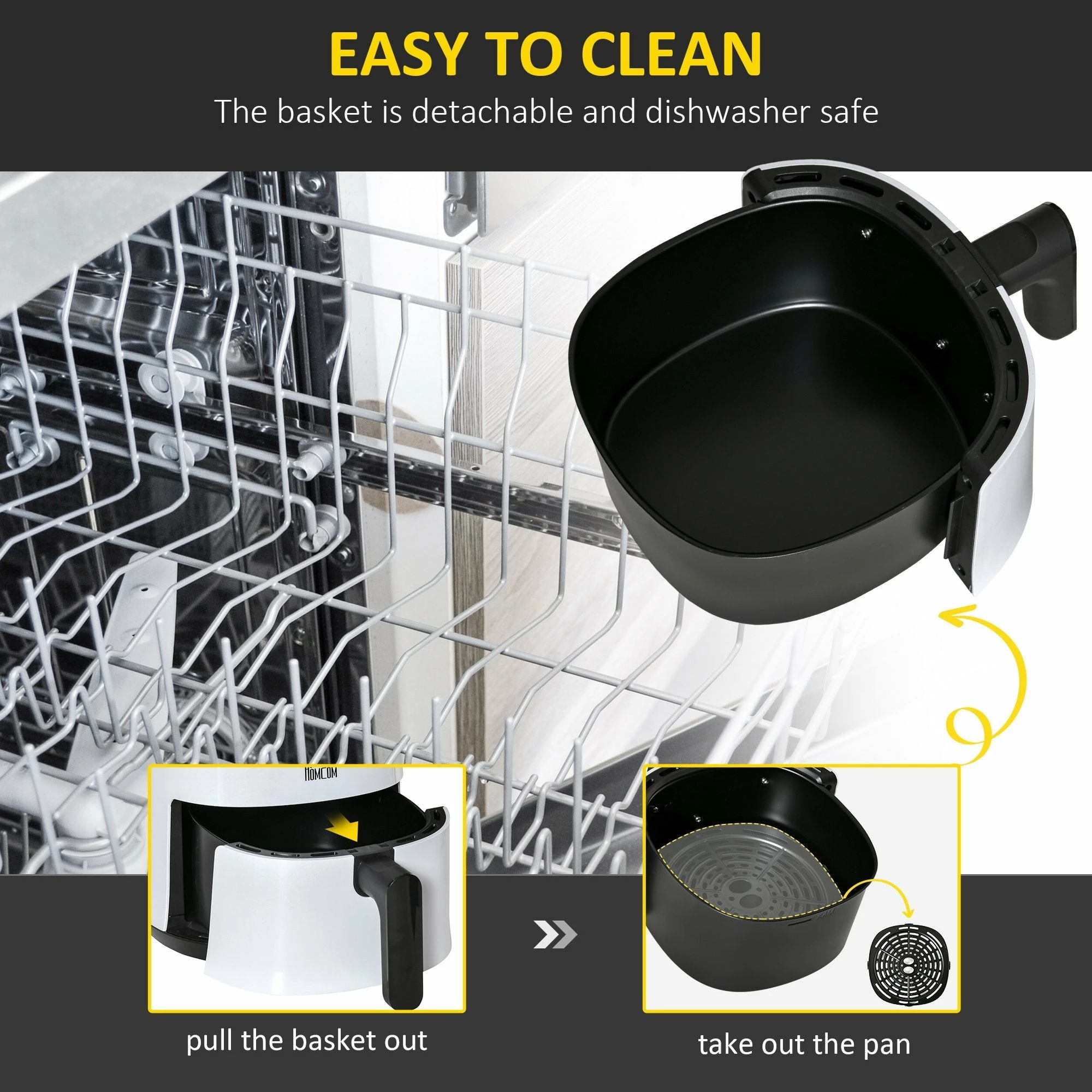 - The basket and pan are detachable and can be washed in dishwasher