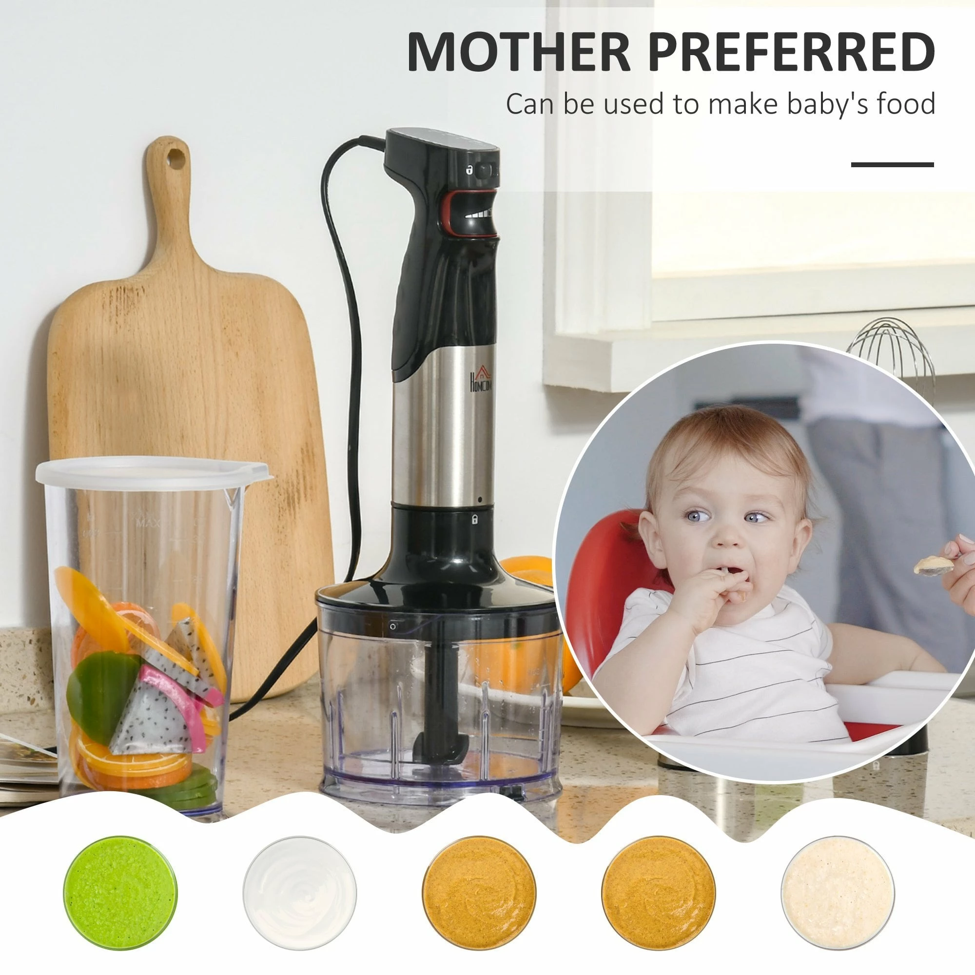Blend even the smallest bits of food with one hand – this handheld piece of equipment from HOMCOM. Powerful at 1000W to get the job done, it comes with various speeds to suit your mixing tasks, with a pulse button for extra power when needed. Sharp steel blades cut food properly – suitable for cutting leaves, pureeing fruits and soft foods, mixing dressings, sauces and more. Also comes with a specific egg whisking attachment for light and fluffy recipes. Simply grip comfortably and mix away!