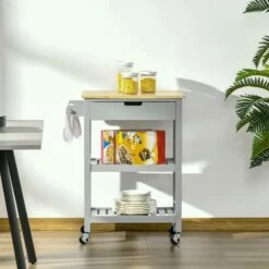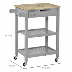 Be the first to review “HOMCOM Kitchen Trolley Utility Cart On Wheels With Rubberwood Worktop, Towel Rack, Storage Shelves & Drawer For Dining Room, Grey Worktop Rack” Cancel reply