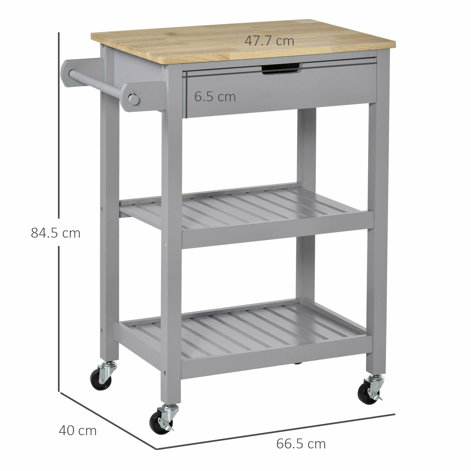 HOMCOM Kitchen Trolley Utility Cart On Wheels With Rubberwood Worktop, Towel Rack, Storage Shelves & Drawer For Dining Room, Grey Worktop Rack