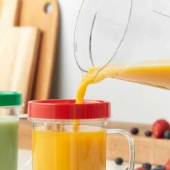 Included in this ingenious set is a blending jug (1L), a large fruit juice blender bottle (500ml) and a small blending cup (300ml) along with 4 drinking cups with different coloured lids.