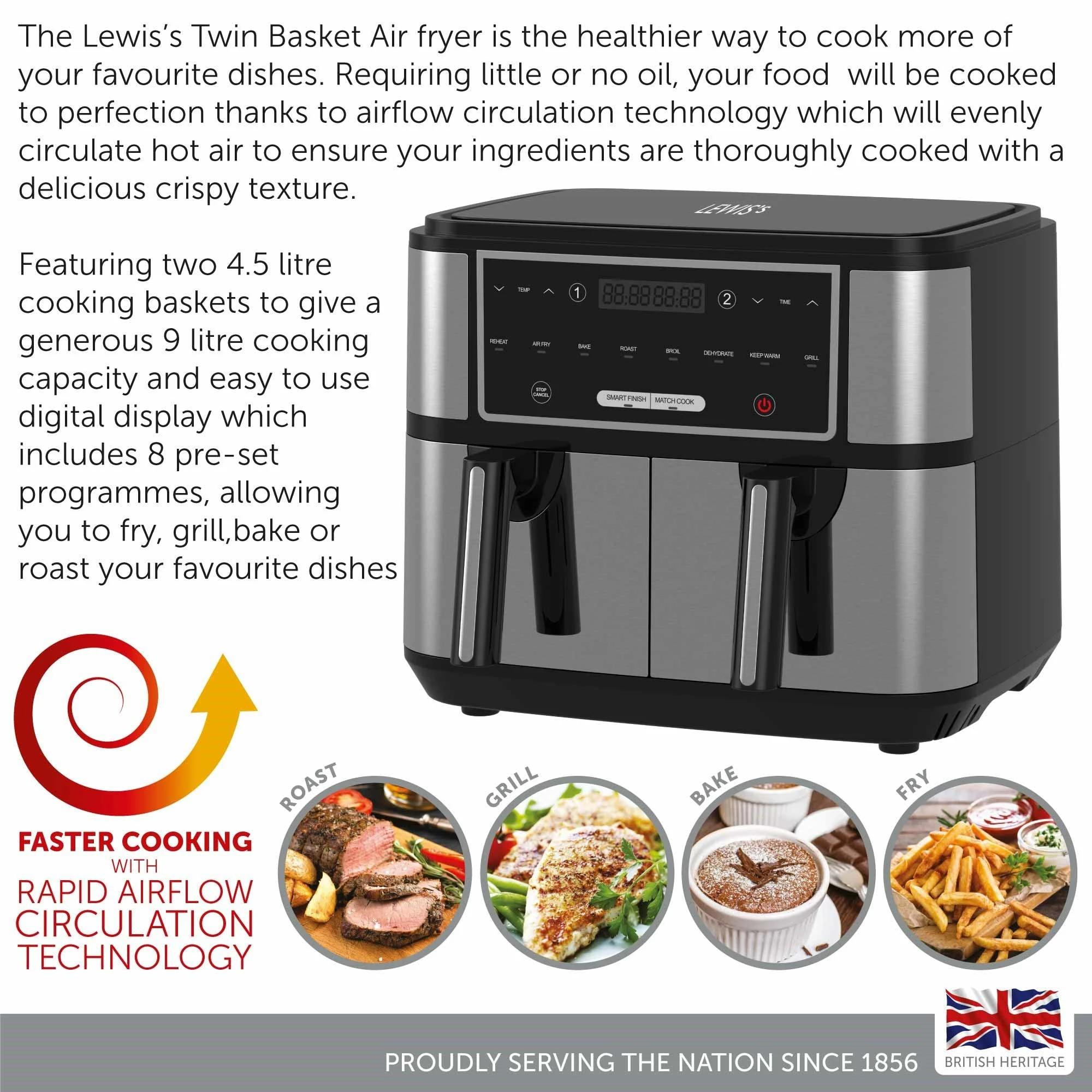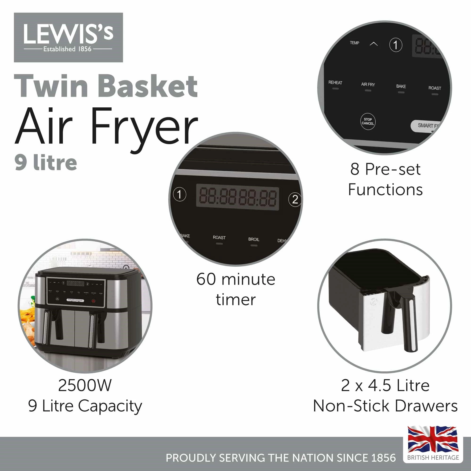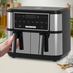 The dual air fryer 9l comes equipped with LED touch control display, 2 x 4.5l non-stick drawers and adjustable temperature function; as well as a timer. The integrated timer feature is operated by dials, allowing you to tweak cooking times and heat settings depending on the type of food you’re cooking.