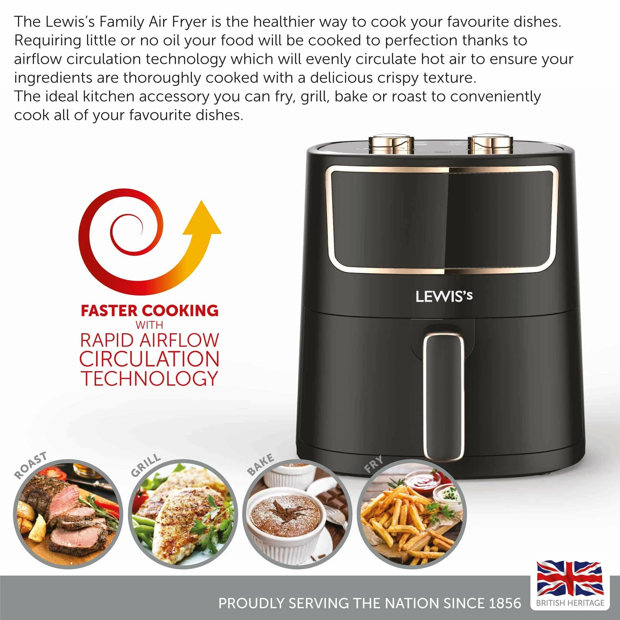 The Lewis’s Family Air Fryer is the healthier way to cook your favourite dishes. Requiring little or no oil your food will be cooked to perfection thanks to airflow circulation technology which will evenly circulate hot air to ensure your ingredients are thoroughly cooked with a delicious crispy texture. The ideal kitchen accessory you can fry, grill, bake or roast to conveniently cook all of your favourite dishes.