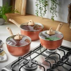 This admirable 3 piece copper pan set includes 16cm, 18cm and 20cm saucepans with lids. Each saucepan is lightweight, durable and suitable for use with all utensils.