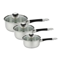 The useful 3-piece pan set includes a 16×8.5cm saucepan with lid, 18×9.5cm saucepan with lid and another 20×10.5cm saucepan with lid. These pan sizes are ideal for cooking alternative dishes as well as boiling and deep frying.