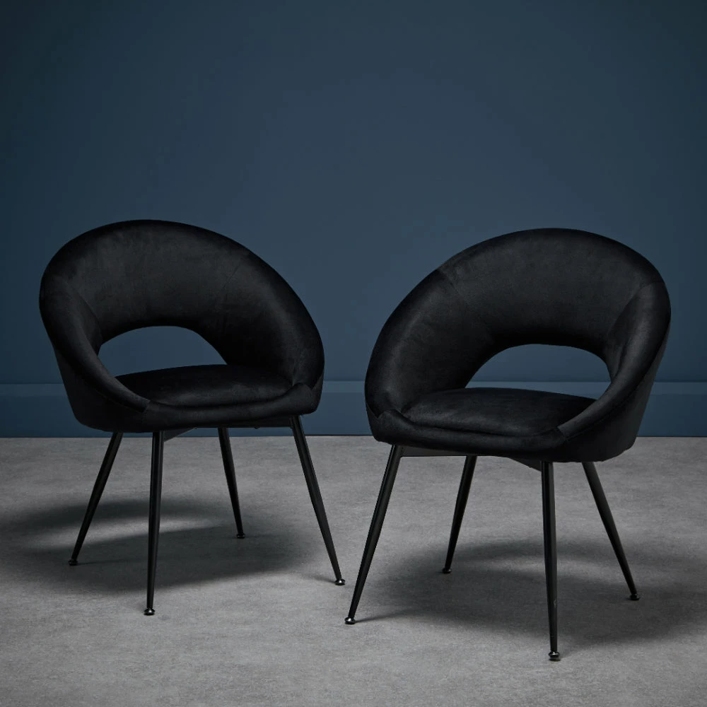 The Lulu velvet dining chair brings together comfort, style and softness with its on trend cut out back. Upholstered in plush velvet available in a choice of soft pink, pale grey or classic black. Sold in packs of 2.