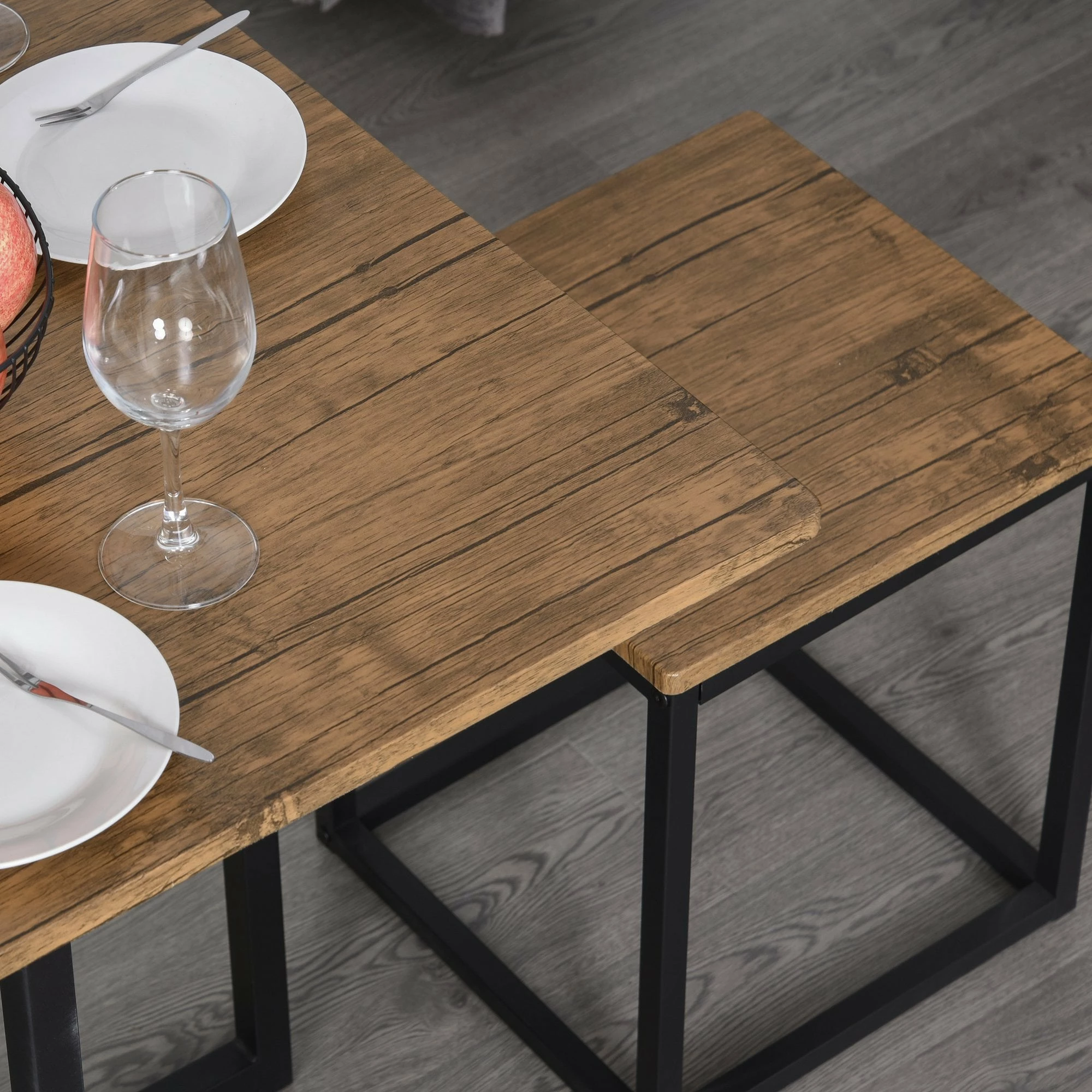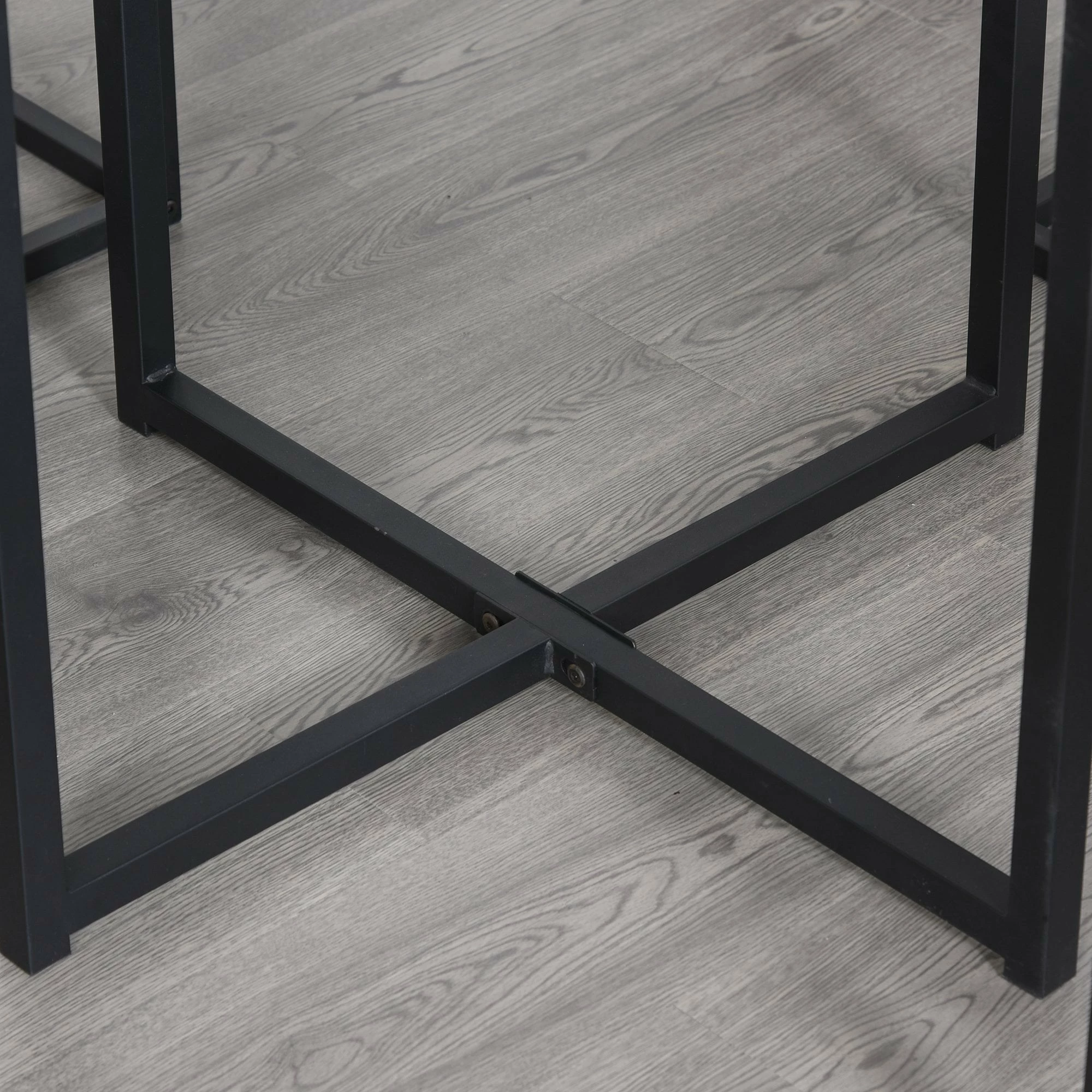 Bring family and friends together in style with this bar table set from . It’s formed of five pieces – four square stools and a tall square table, giving room to sit, dine and relax. Every frame is constructed from solid steel for strength, and crafted into a modern and cool boxy shape. Black in colour, the frame provides a cool contrast to the wood-effect of the MDF seats, whilst still keeping a classic tonal palette to suit every style decor. It’s finished with a melamine coating on the seats for a smooth feel and protection against light marks and scruffs. Each chair can be tucked in beneath the table top when not in use to save space.