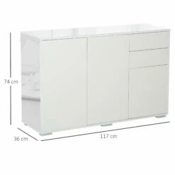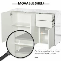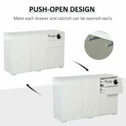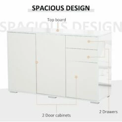 HOMCOM Modern elegance cabinet presents a durable, stylish and convenient addition to living room, bathroom, bedroom, kitchen and office. Crafted from solid E1 grade MDF board and with anti-toppling device for added strength, this stable indoor cabinet will stand up to years of use. Practical enough with two push open design storage cabinets, two drawers and top part for storing daily items. Corner feet prop the cabinet off of the floor for increased airflow, cleaning accessibility, and as a guard against water damage should a bathroom or kitchen leak occur.