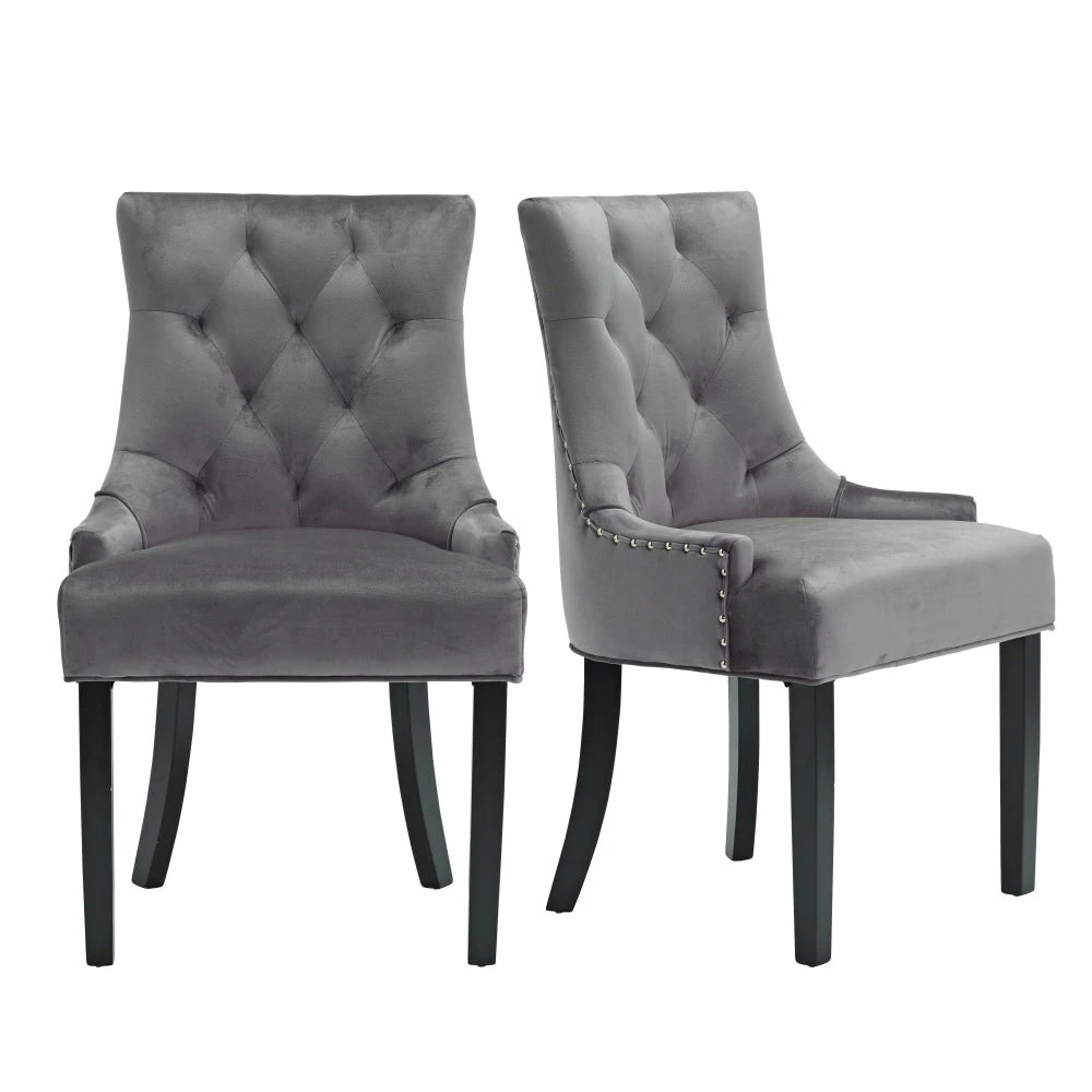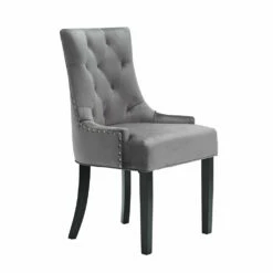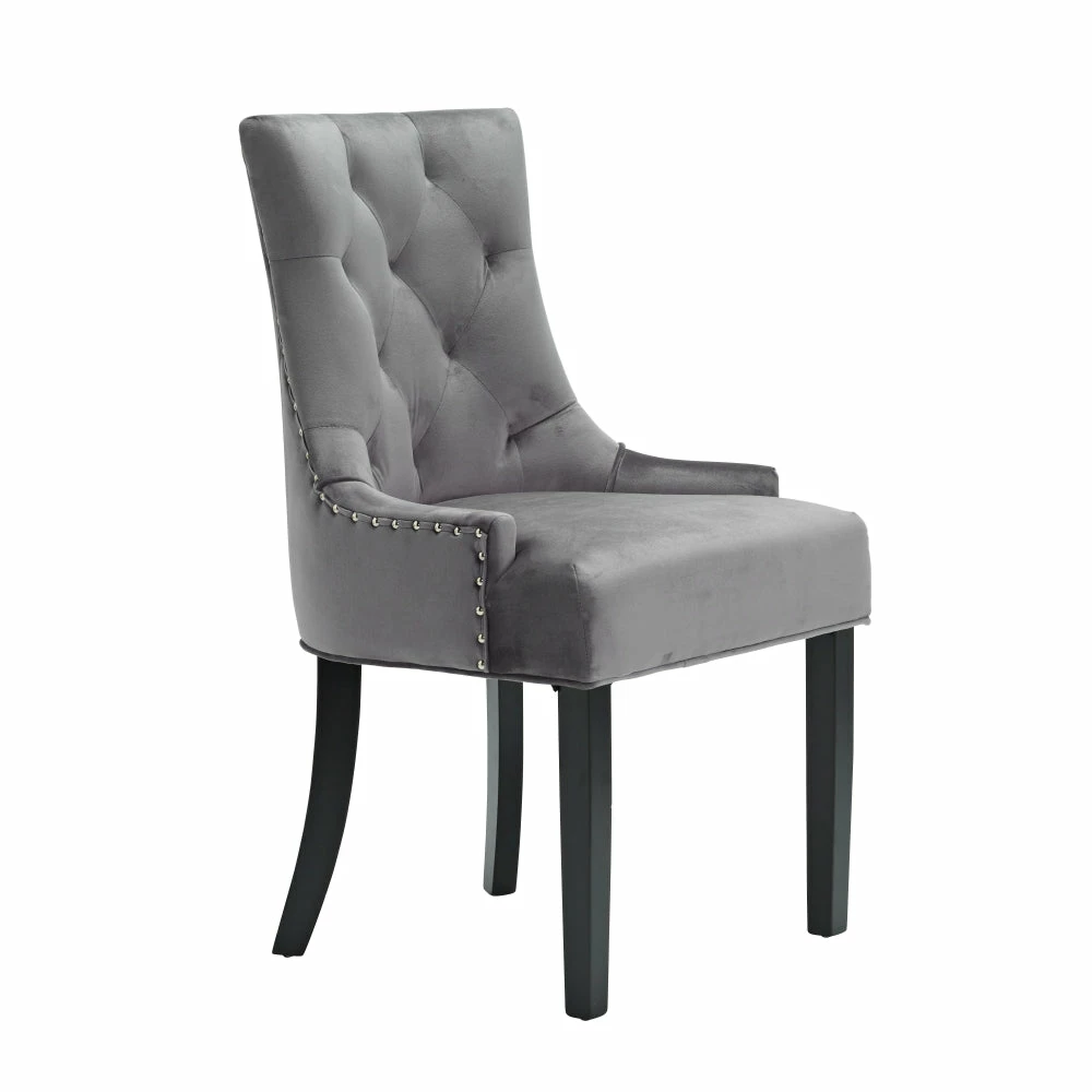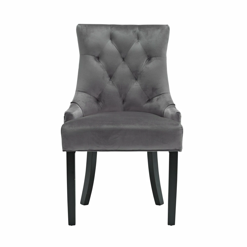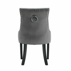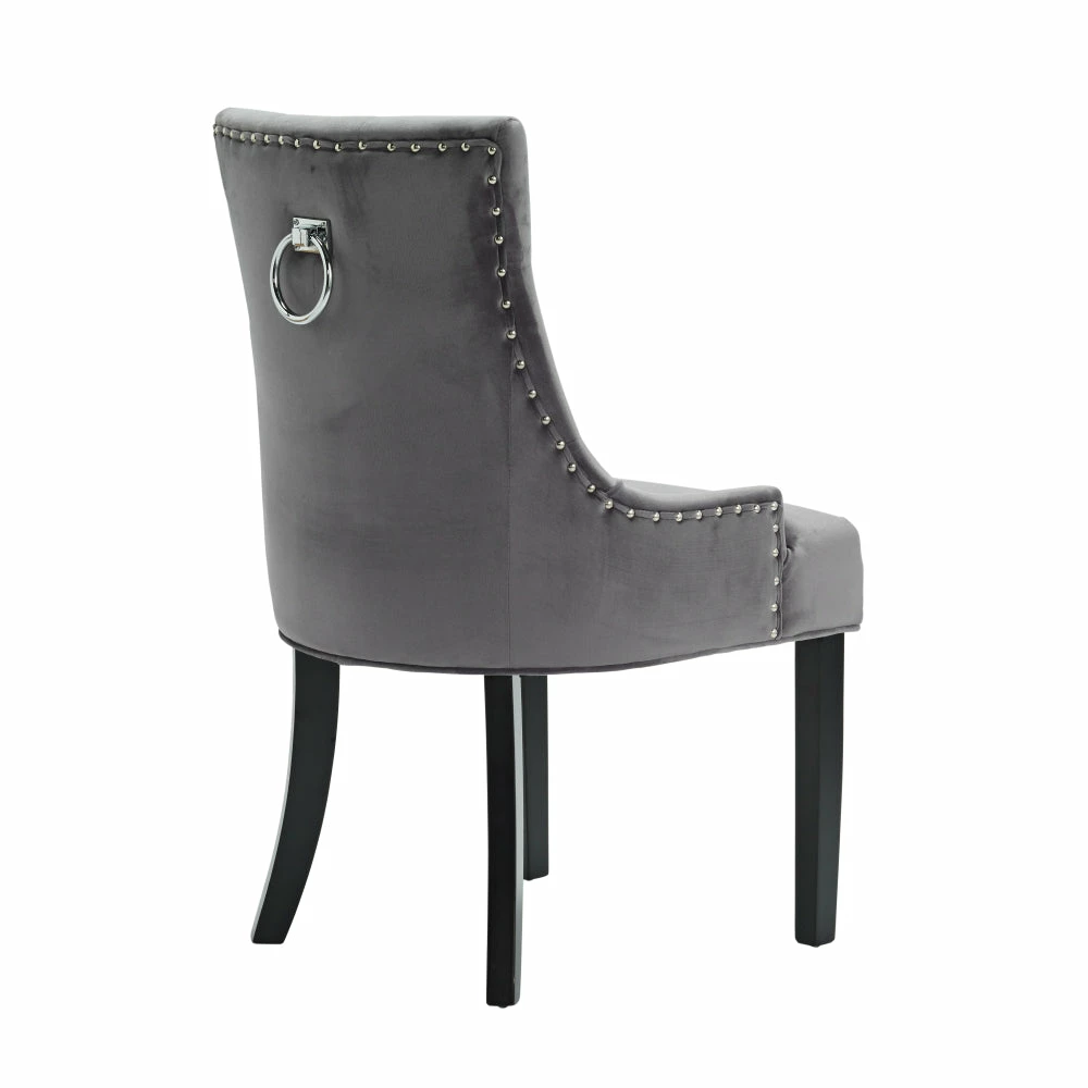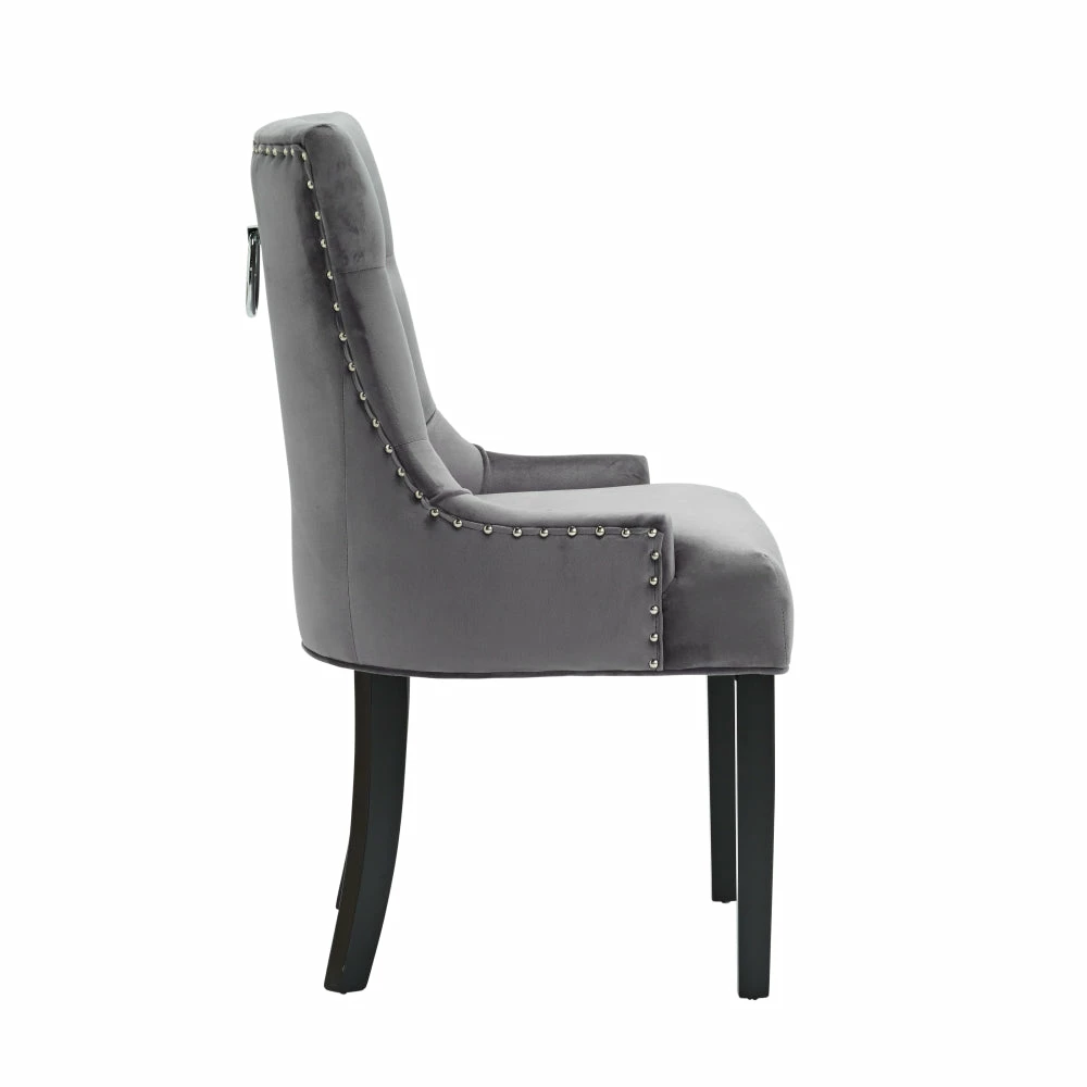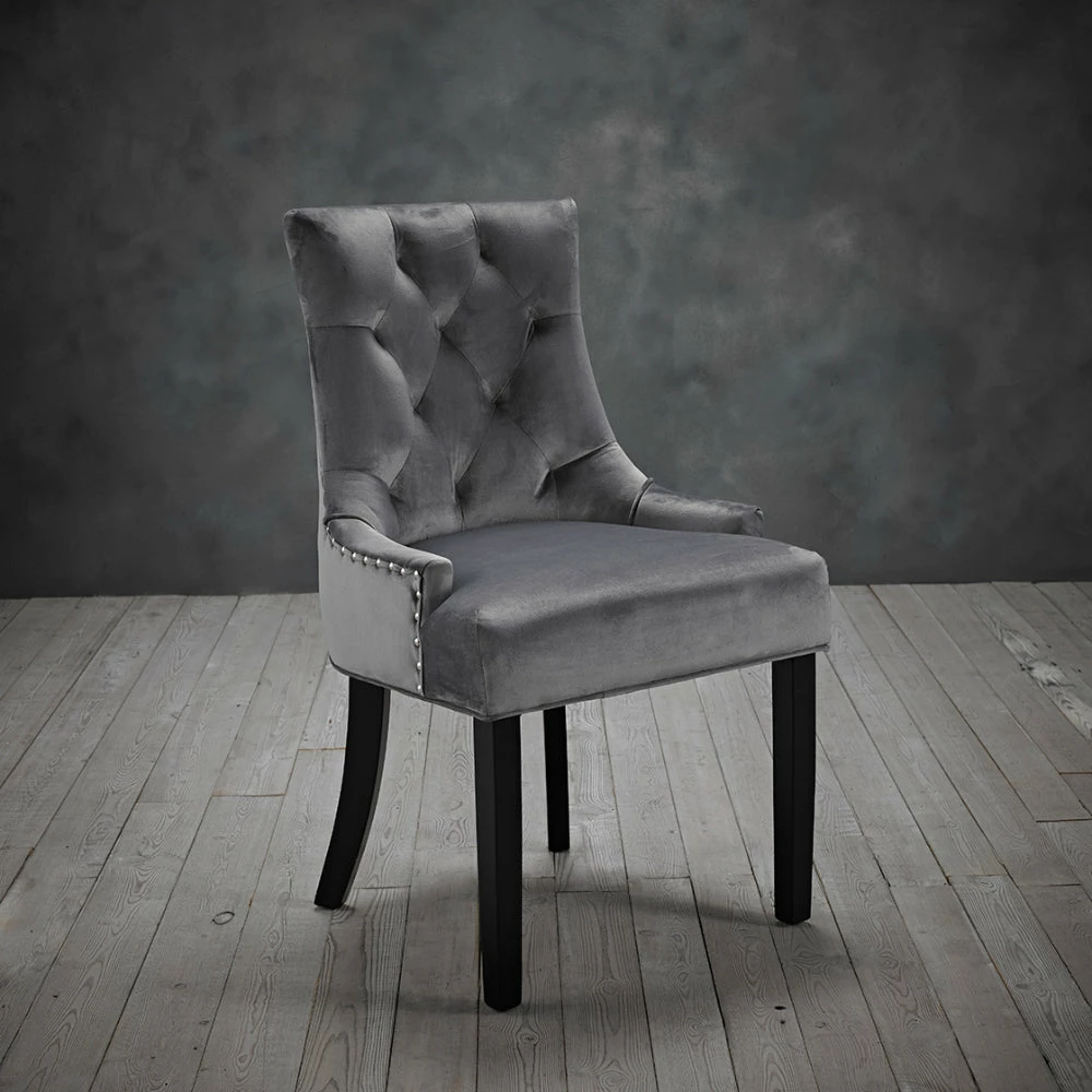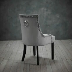 A regal looking fabric chair with solid wood legs and silver finish knockerback ring for that extra wow factor.
