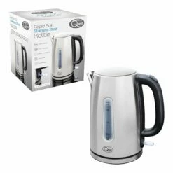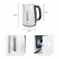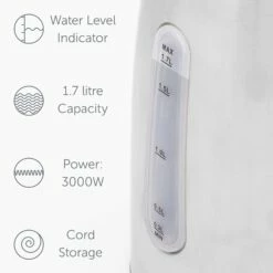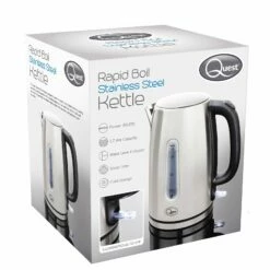 Designed to perform as well as it look, the Quest 1.7 Litre Jug Kettle is an affordable kettle for any kitchen. This kettle has an external water level indicator that allows you to measure the amount of water you need. The illuminated switch is a great addition to know when the kettle is turned on. The 3000W will swiftly head up the water and has a generous capacity of 1.7 litres. This Quest Kettle comes in a striking silver stainless steel that will add a modern edge to any kitchen decor.Â