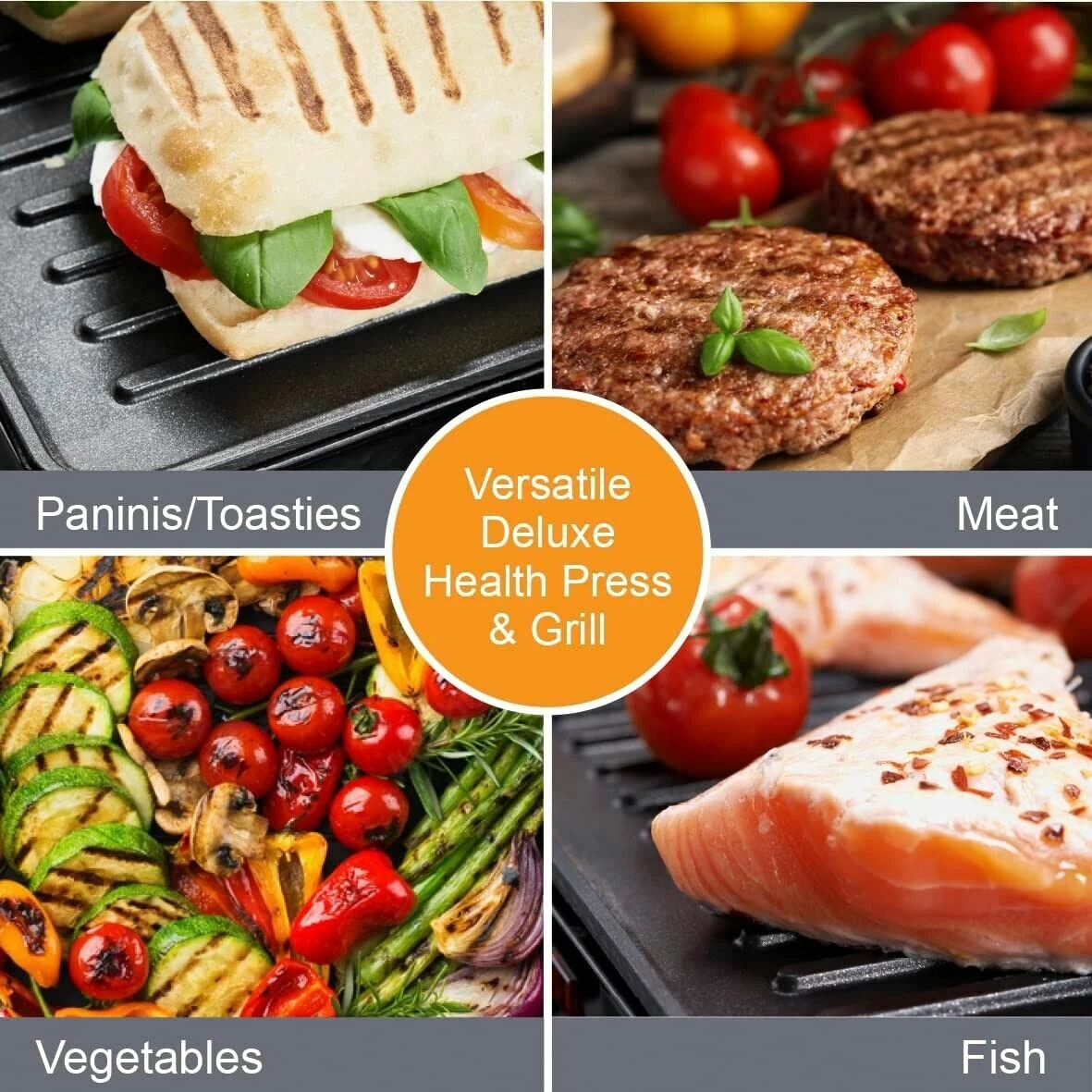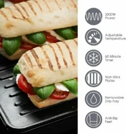 “The 180 degree stainless grill and press features a hinged lid and variable temperature control, choose from light to high to ensure you get the perfect level of cooking depending on your choice of food. This health grill is perfect for cooking thicker cuts of meat, fish, steaks, vegetables and paninis.