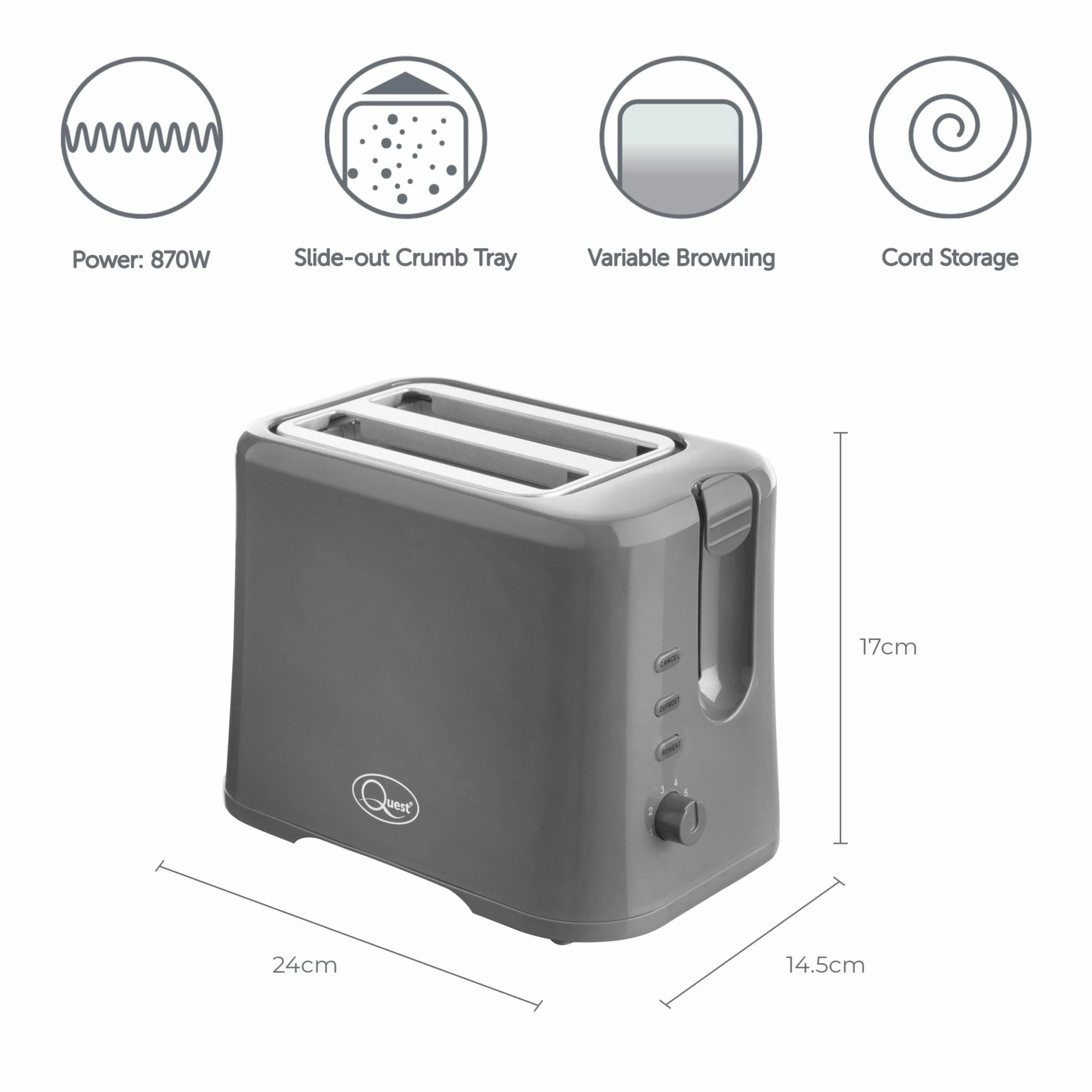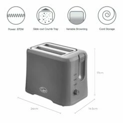 The Quest 2 Slice toaster combines modern design with practical performance, this grey toaster makes a great addition for any home decor and is ideal for those who want to save space in their kitchen.Â