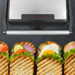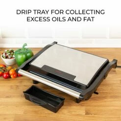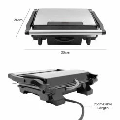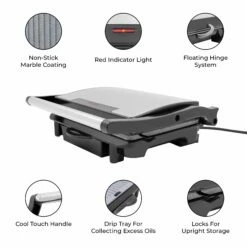 This Quest health grill and panini press features non-stick marble finished cooking plates and a hinged lid for healthy and versatile cooking. The grill has a handy temperature dial, allowing you to achieve the perfect level of cooking, depending on your choice of food. A cool touch handle and non-slip feet for added safety when the grill is in use. The grill also locks shut and features a cord wrap for compact storage.Â