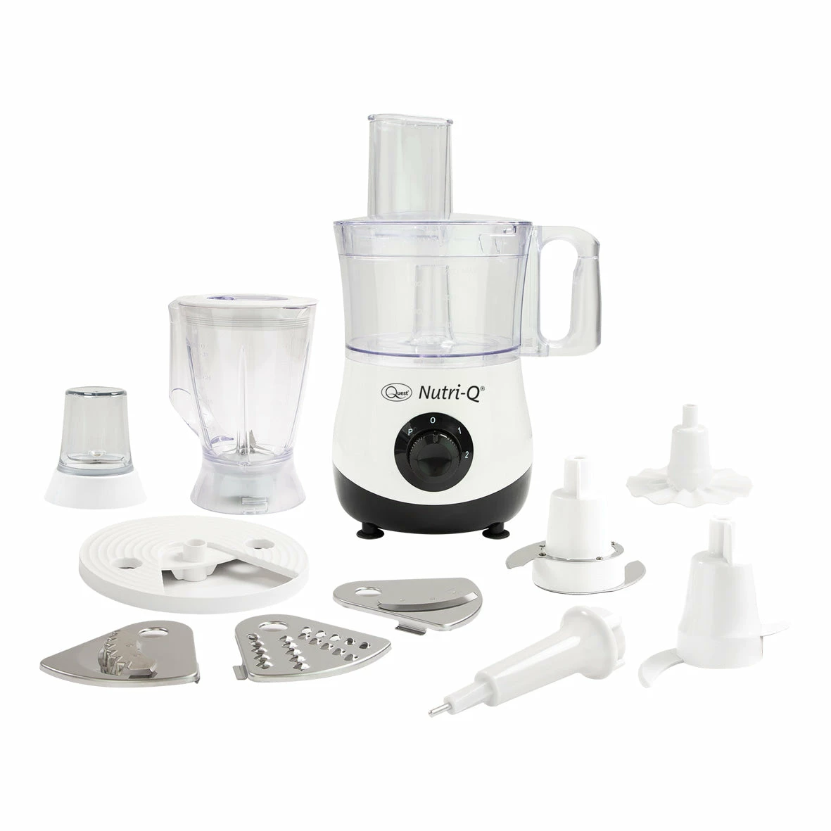 The Nutri-Q processor is an ideal aid to creating and maintaining a balanced, healthy range of meals and beverages. Fresh juice, smoothies or milkshakes can be blended as easily as ice, nuts, salsas and dips. Slice vegetables and grate cheese, potatoes and other vegetables to create colourful salads. Whisk eggs, add ingredients to prepare a healthy omelette mix. Utilise the dough tool for flat bread or other light bread mixes. All accessories BPS fee and dishwasher safe.