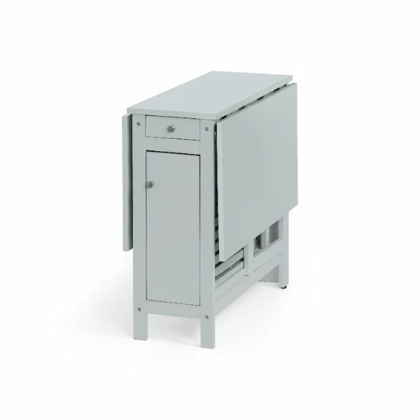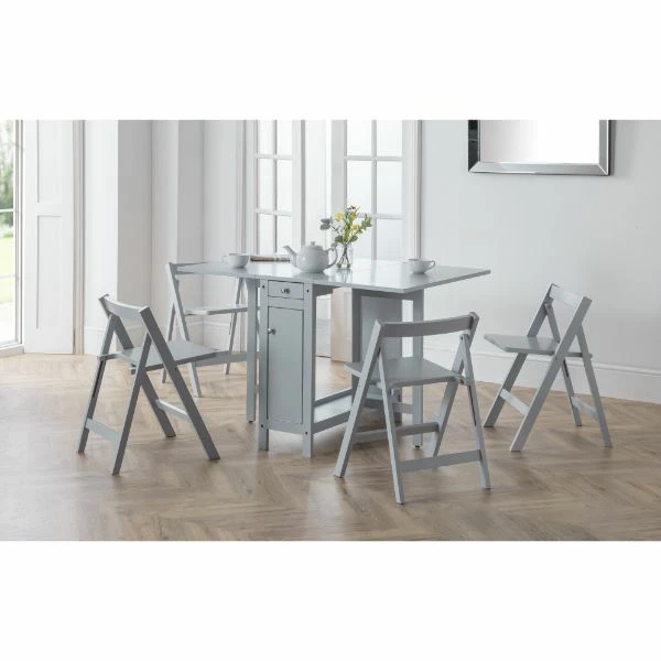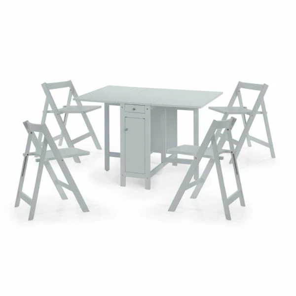 A neat and functional, space saving dining set where the chairs can be folded and stored Inside the table. This dining set is a timeless classic that features a integrated storage drawer, perfect for small spaces with less storage. Available in a light grey, white and natural, or an all over light oak finish.??