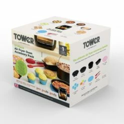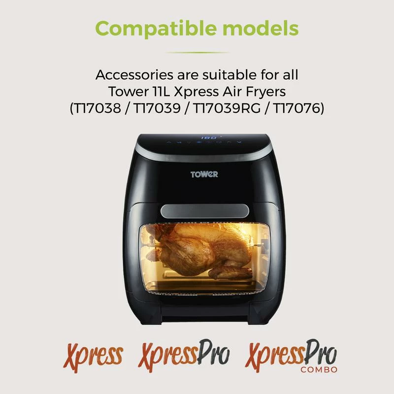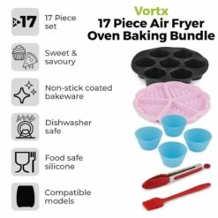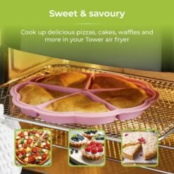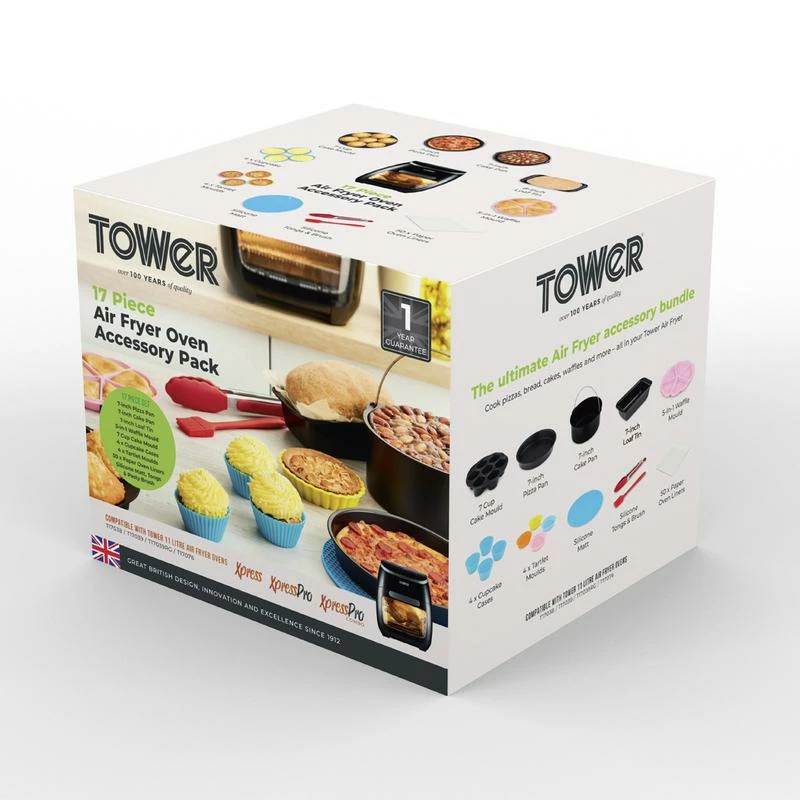 Cook up delicious pizzas, cakes, waffles more with the ultimate 17-Piece Vortx Air Fryer Oven Baking Bundle suitable for all Tower 11L Xpress Air Fryers (T17038 / T17039 / T17039RG / T17076). Includes 1 x 7-inch cake pan, 1 x 7-inch pizza pan, 1 x 7-inch loaf tin, 1 x rubber mat, 1 x 7-in-1 cupcake mould, 4 x single cupcake cases, 1 x 5-in-1 waffle mould, 4 x tartlet moulds, 1 x brush, 1 x tongs, 50 x parchment paper liners, for all your air frying needs. The only Tower air fryer baking bundle that helps you to cook up a wide variety of meals snacks including delicious pizzas, cakes, waffles and more, making it an all-in-one essential kitchen set. Crafted with superior non-stick material for fuss-free cooking cleaning. Enjoy a delicious homemade victoria sponge, spicy pepperoni pizza or sweet cinnamon waffle, then simply pop the accessories into the dishwasher let the grease grime wash away. Looking for inspiration? Scan the QR code included with this product for an exclusive air fryer recipe book