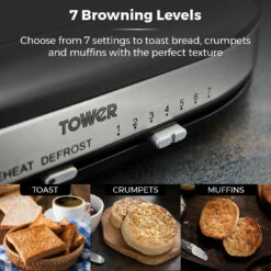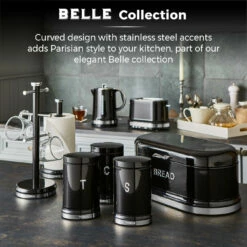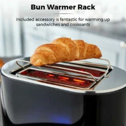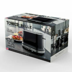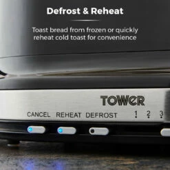 This Tower Belle 2-slice toaster adds a touch of elegance to your breakfast routine. Presented in a stylish Parisian design, the toaster flaunts gorgeous curves wrapped around a rich noir exterior with chrome accents which boldly stand out in your kitchen. The self-centring function and variable browning controls ensure bread, crumpets and muffins are toasted to your preferred texture and colour. Defrost and reheat settings allow you to toast from frozen or reheat cold food back up before serving. It also comes with a bun warming rack accessory to warm up sandwiches, croissants and other toasted snacks. A removable crumb tray provides quick and easy cleaning, while the integrated cord storage keeps your surfaces neatly presented.