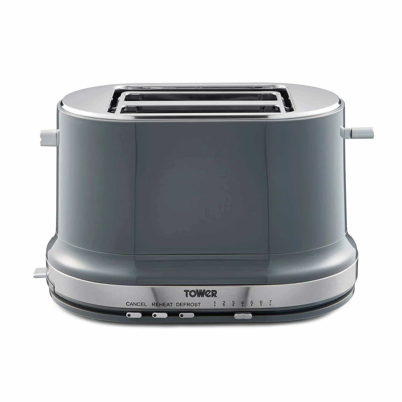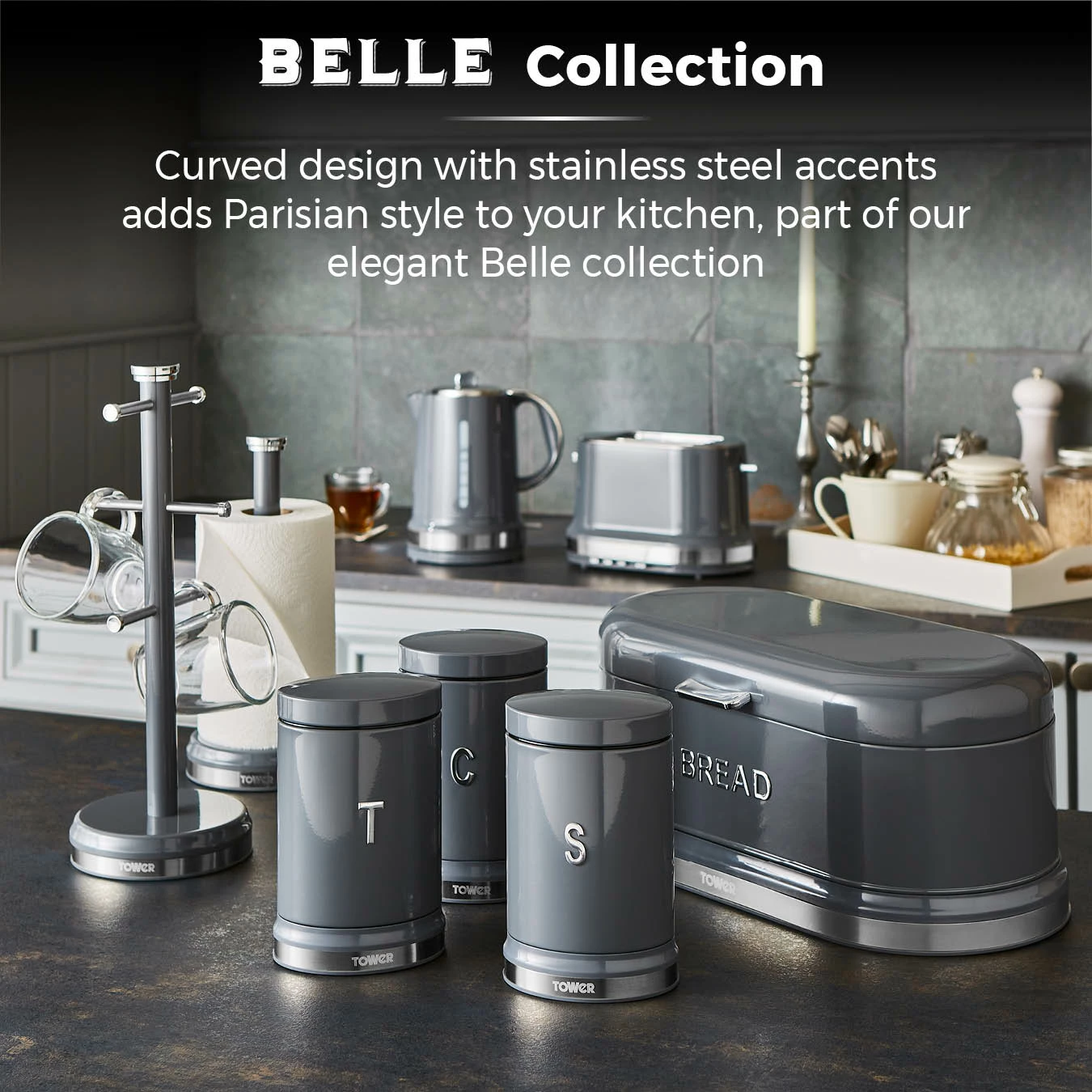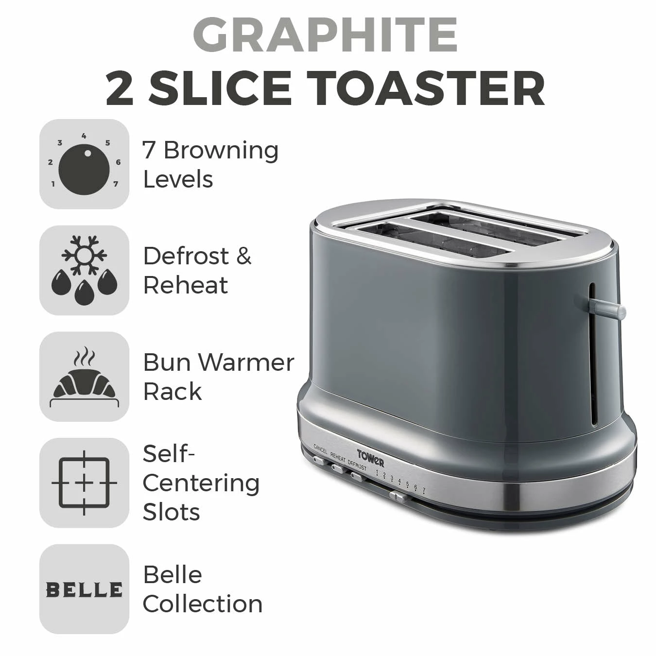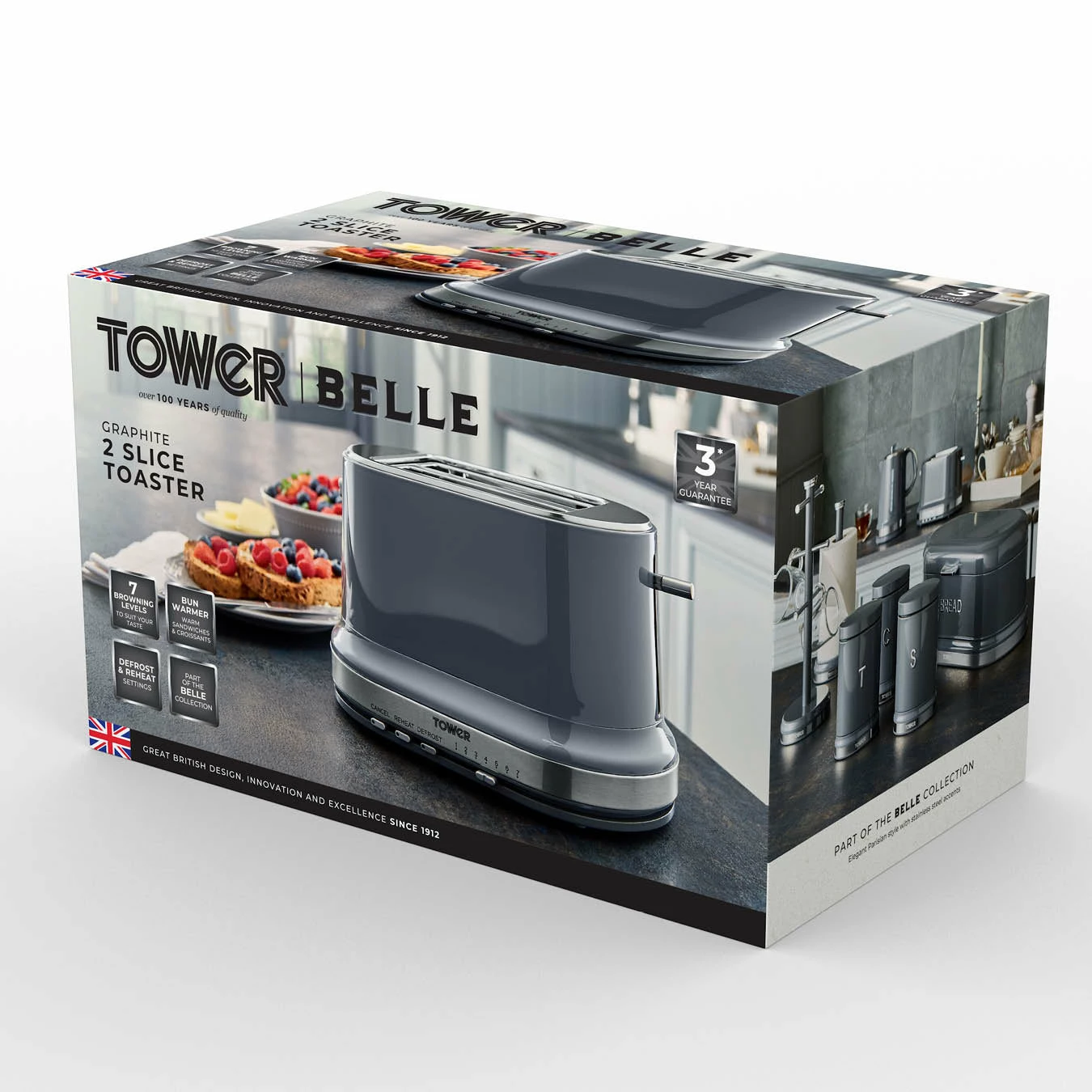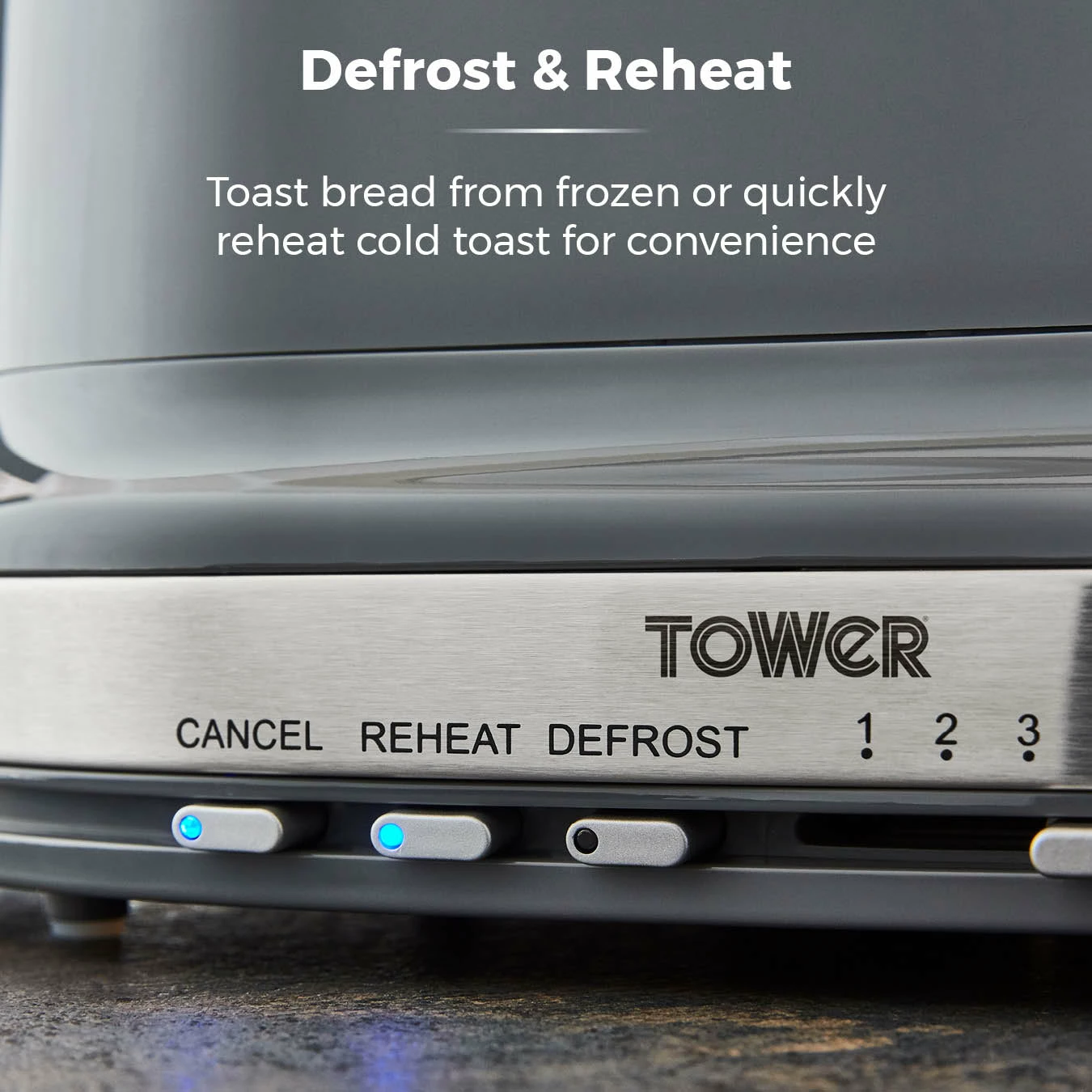 This Tower Belle 2-slice toaster adds a touch of elegance to your breakfast routine. Presented in a stylish Parisian design, the toaster flaunts gorgeous curves wrapped around a rich noir exterior with chrome accents which boldly stand out in your kitchen. The self-centring function and variable browning controls ensure bread, crumpets and muffins are toasted to your preferred texture and colour. Defrost and reheat settings allow you to toast from frozen or reheat cold food back up before serving. It also comes with a bun warming rack accessory to warm up sandwiches, croissants and other toasted snacks. A removable crumb tray provides quick and easy cleaning, while the integrated cord storage keeps your surfaces neatly presented.