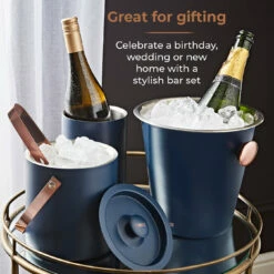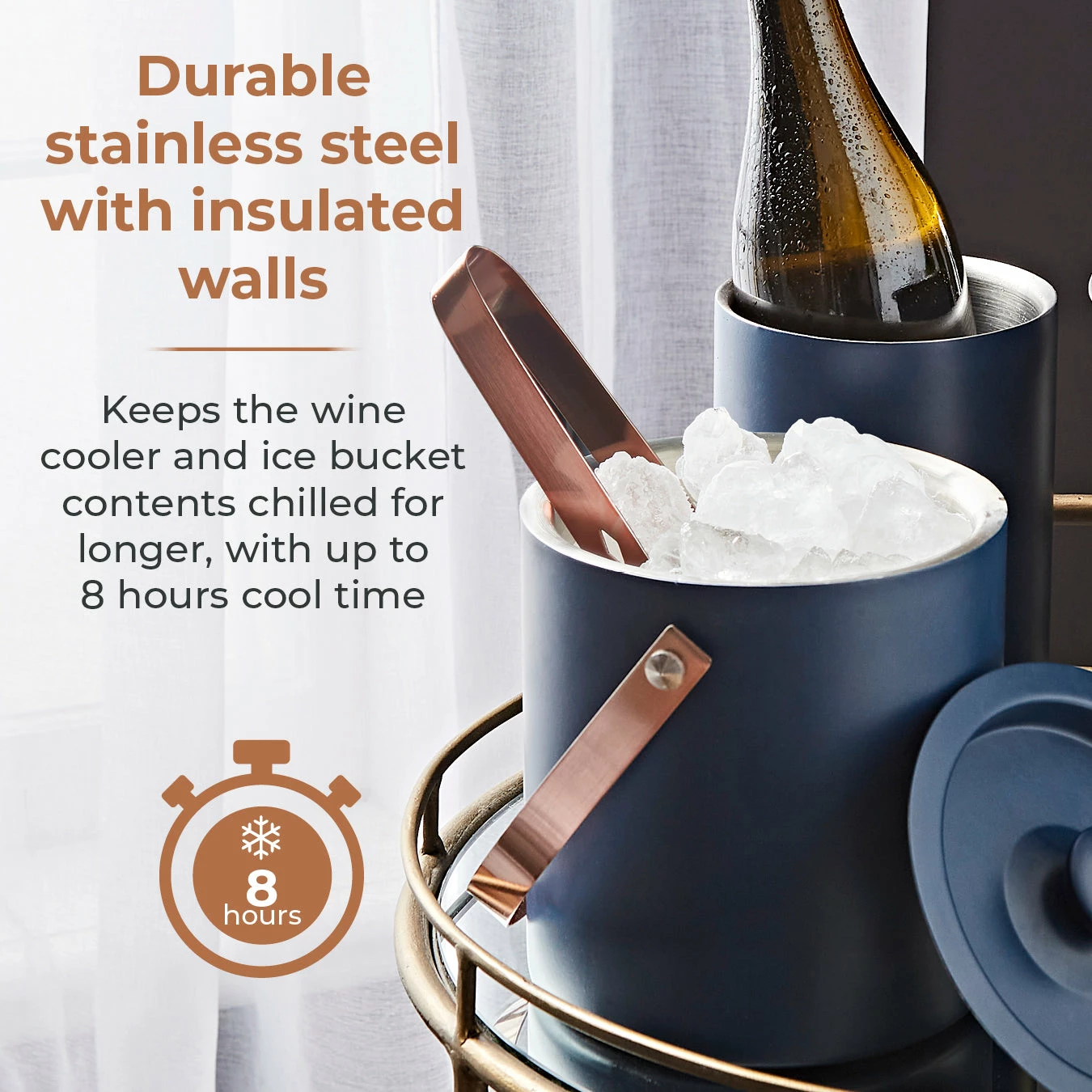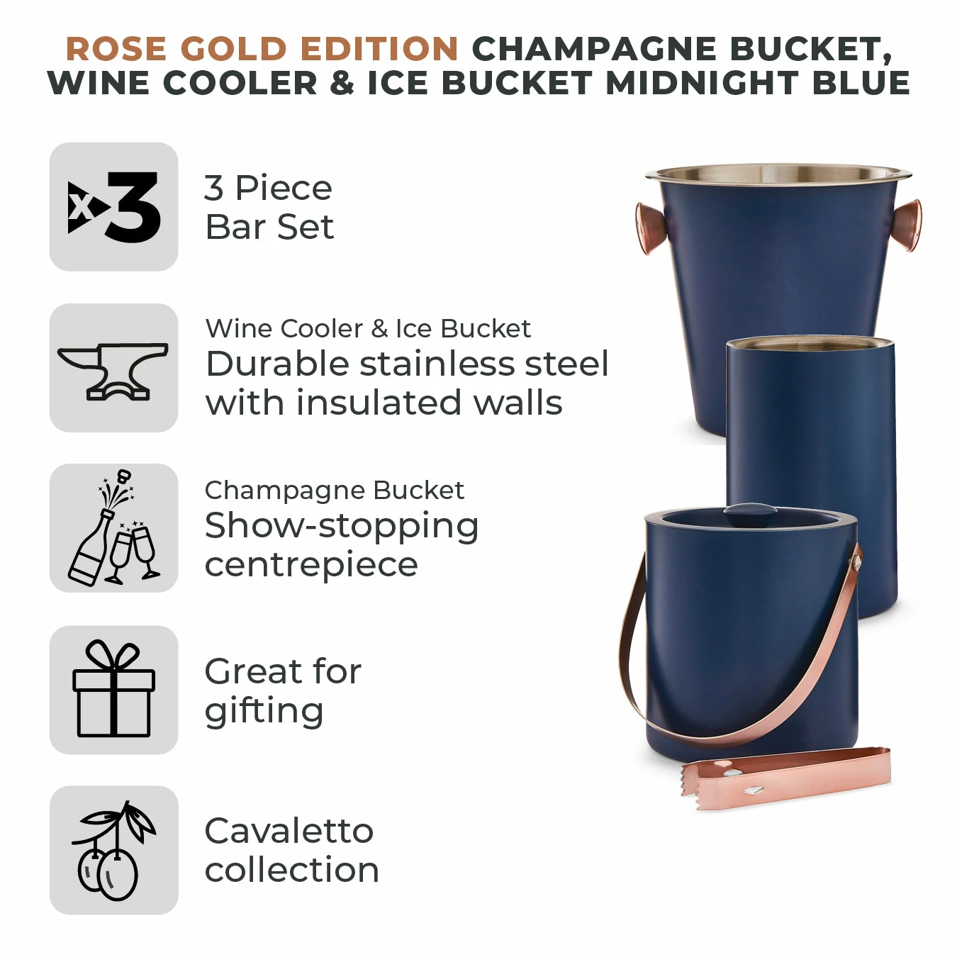Upgrade your dinner parties with the Cavaletto 3 Piece Bar Set. This all-in-one set includes a wine cooler, ice bucket and champagne bucket, designed with up to 8 hours cool time so you can sit back and relax with friends without constant trips to the fridge. Crafted from durable stainless steel and featuring insulated walls, the wine cooler and ice bucket are designed to keep your drinks cooler for longer. Upgrade your dinner parties and impress guests with a show-stopping champagne bucket centrepiece. With stylish rose gold handles, you can serve up some chilled fizz to your guests in undeniable style. Celebrate a birthday, wedding or new home with a stylish barware set, that will add a touch of elegance to any decor.
