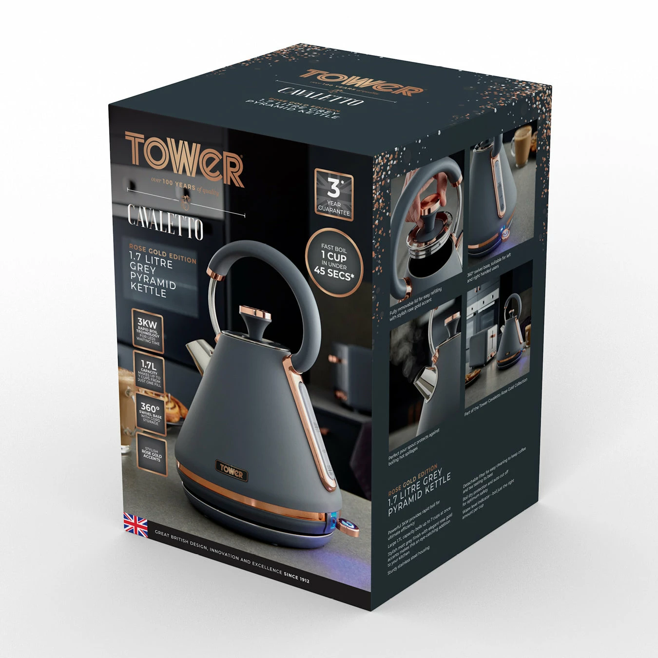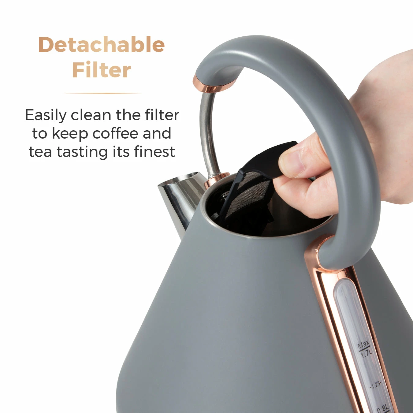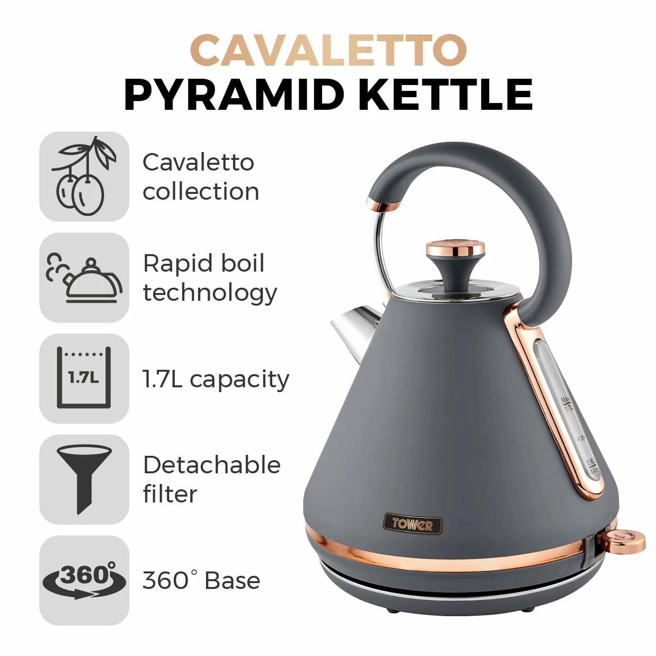 Add contemporary style to your kitchen with this elegant Cavaletto Pyramid Kettle from Tower. It features a matte jade finish with lustrous champagne accents, making this kettle an eye-catching addition to any countertop. Full of modern functionality, it’s powered by rapid boil technology to reduce your wait for a delicious hot drink, boiling 1 cup in less than 45 seconds. A large 1.7L capacity lets you make up to 7 drinks from a single fill, ideal for families and busy households alike. With a detachable filter, you can easily remove and rinse away limescale to keep your coffee and tea tasting its best. The perfect pour spout protects against boiling hot water spillages, while the 360-degree swivel base and fully-removable lid make it simple to lift and refill the kettle no matter whether you’re left or right-handed.