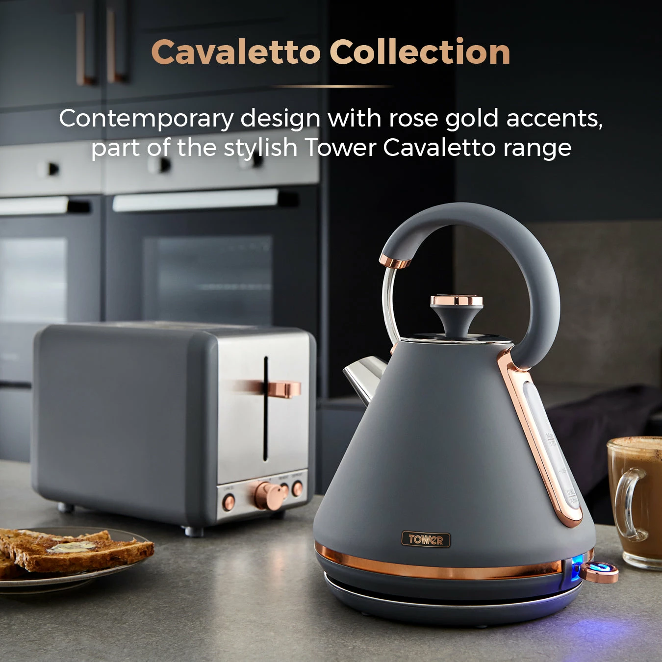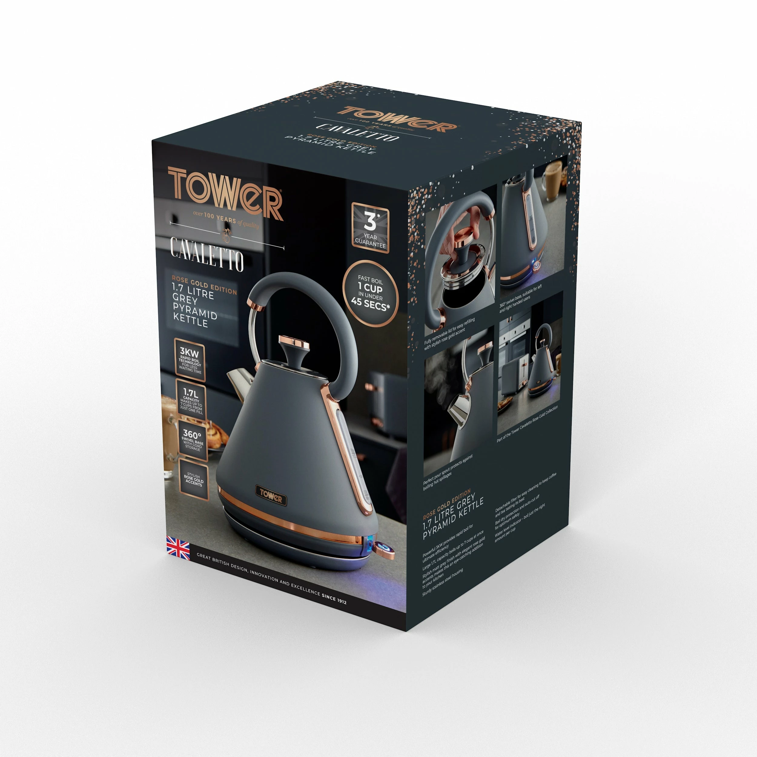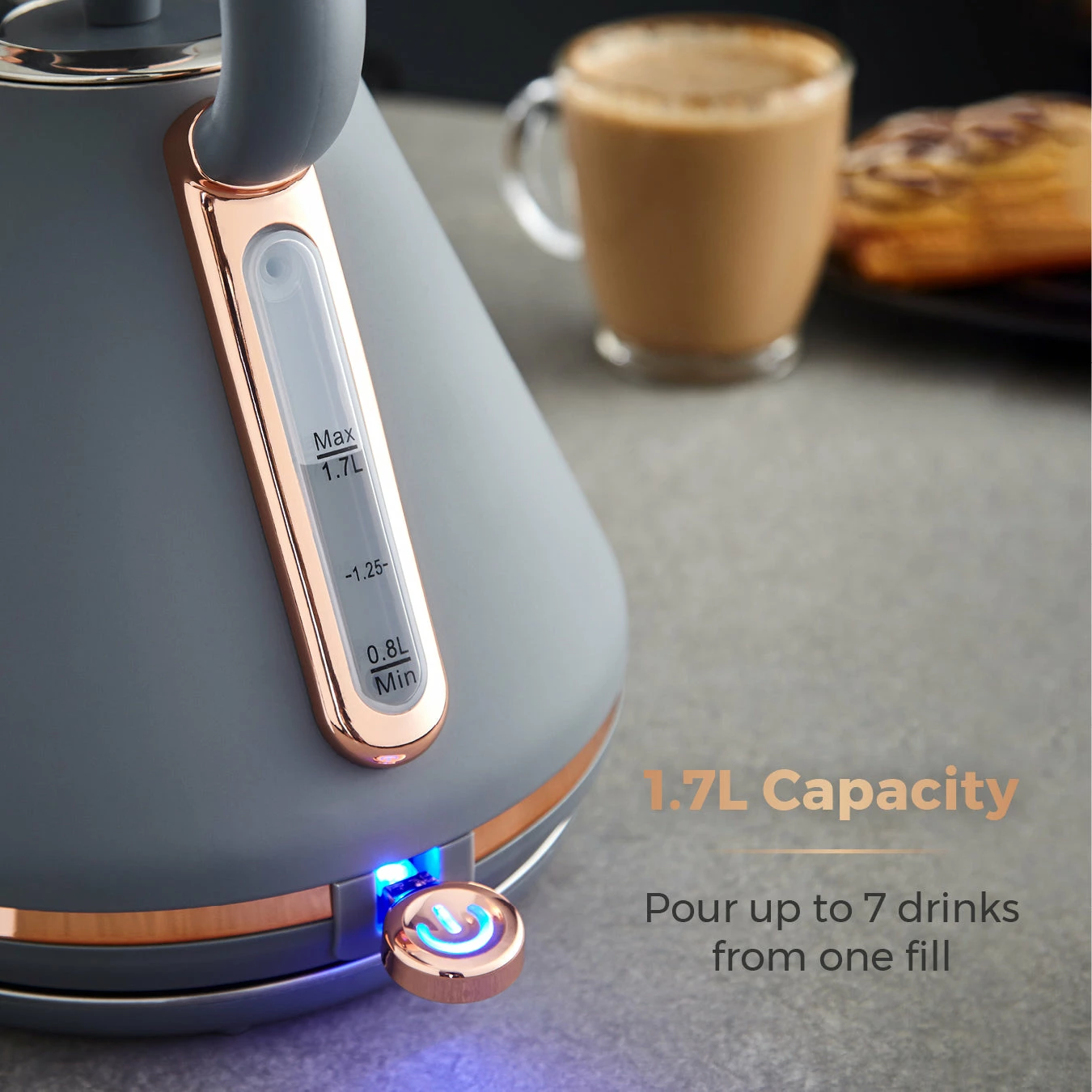 Add contemporary style to your kitchen with this elegant Cavaletto Pyramid Kettle from Tower. It features a matte jade finish with lustrous champagne accents, making this kettle an eye-catching addition to any countertop. Full of modern functionality, it’s powered by rapid boil technology to reduce your wait for a delicious hot drink, boiling 1 cup in less than 45 seconds. A large 1.7L capacity lets you make up to 7 drinks from a single fill, ideal for families and busy households alike. With a detachable filter, you can easily remove and rinse away limescale to keep your coffee and tea tasting its best. The perfect pour spout protects against boiling hot water spillages, while the 360-degree swivel base and fully-removable lid make it simple to lift and refill the kettle no matter whether you’re left or right-handed.