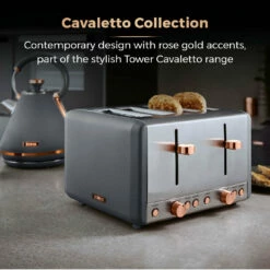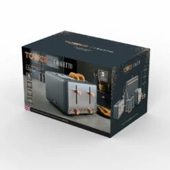 Serve up to four slices of freshly-toasted bread, crumpets or bagels with the Tower Cavaletto 4-slice toaster. With variable browning settings, you have more control over the toasting time to get the texture and taste which suits you best. The defrost, reheat and cancel options offer more functions, allowing you lightly warm up snacks or toast bread straight from frozen for a quick breakfast solution. The removable tray makes it easy to dispose of excess crumbs to keep your countertop clean, with cord storage to keep your surface neat and free from wires. Finished in stainless steel with jade and champagne colouring, the Cavaletto toaster complements the look of your kitchen countertop.