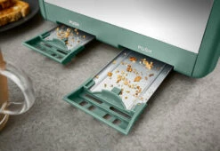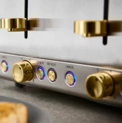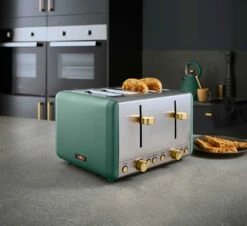 Serve up to four slices of freshly-toasted bread, crumpets or bagels with the Tower Cavaletto 4-slice toaster. With variable browning settings, you have more control over the toasting time to get the texture and taste which suits you best. The defrost, reheat and cancel options offer more functions, allowing you lightly warm up snacks or toast bread straight from frozen for a quick breakfast solution. The removable tray makes it easy to dispose of excess crumbs to keep your countertop clean, with cord storage to keep your surface neat and free from wires. Finished in stainless steel with jade and champagne colouring, the Cavaletto toaster complements the look of your kitchen countertop.