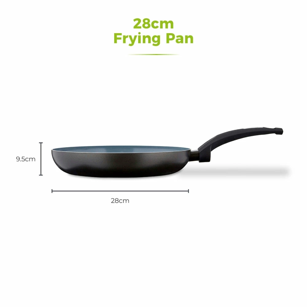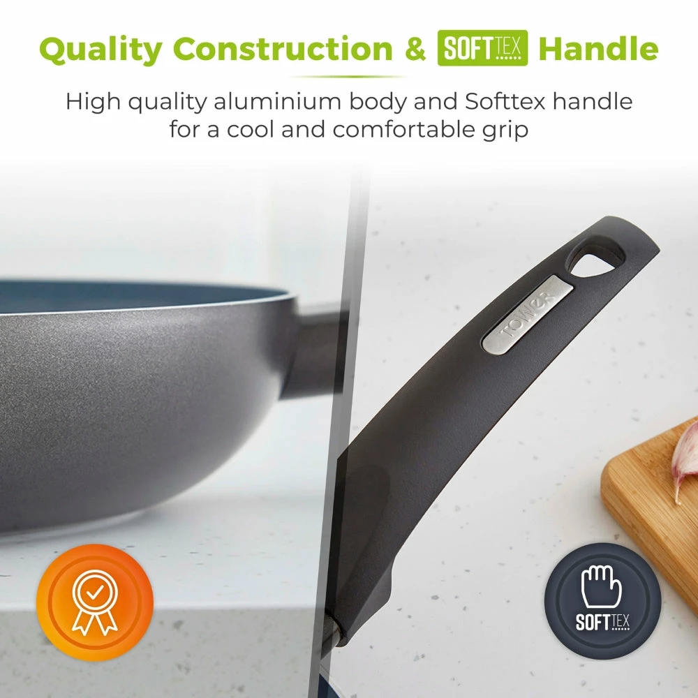 This Tower Cerasure 28cm Frying Pan offers health-conscious cooks an optimal combination of durability, versatility, and toxin-free cooking. Its high-quality aluminum construction and bonded steel base ensure even heat distribution, while its Cerasure ceramic non-stick coating is three times stronger than the competition and requires little oil. The pan is dishwasher safe, but hand-washing is recommended to keep it looking its best and is suitable for all hob types, including induction. This pan is 100% recyclable, and its Softtex handle features an ergonomic, phenolic design that stays cool to the touch for a comfortable grip. Perfect for all levels of cooks, the PFOA-, PTFE-, PFOA-, lead- and cadmium-free Cerasure coating is perfect for oil-free frying of dishes like stir-fries and omelets.