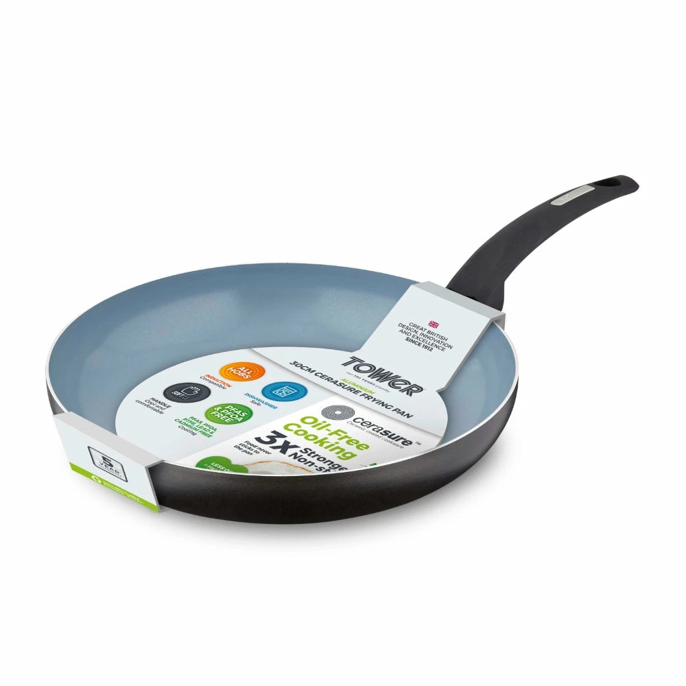 This 30cm Tower Cerasure Frying Pan is an ideal choice for healthier cooking without compromising on taste. Constructed from high-grade aluminum, it’s perfect for making stir-fries and omelets. The Cerasure ceramic non-stick coating is three times stronger than traditional materials, reducing the need for oil and preventing food from sticking. It’s also dishwasher-safe – though hand-washing is recommended to preserve the finish – and suitable for all stove types, including induction. Cerasure ceramic coating is free from PFAS, PFAO, PTFE, lead, and cadmium, making it perfect for cooks of all levels. Its bonded steel base evenly distributes heat with no hot spots, ensuring the food is cooked thoroughly. The handle has been designed with an ergonomic, phenolic Softtex handle, which stays cool to the touch for a comfortable grip. Additionally, the product and packaging are 100% recyclable.