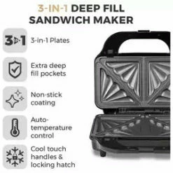 This Tower 900W 3-in-1 rose gold deep filled snack maker is a quick and efficient way of creating the perfect snack in minutes. It includes interchangeable plates, letting you make sandwiches, waffles and grill for ultimate versatile cooking. The dual non-stick easy clean ceramic plates remove the need for oil or butter, so you can enjoy a healthier snack. This snack maker also has the added benefit of cooking both sides at the same time without the need to flip, making the perfect seal to lock in your ingredients. The sandwich toastie maker features power on/ready indicator lights, so you know when it’s ready to be used, while the automatic temperature control gives you perfect results every time. Non-slip feet help keep the maker sturdy on your kitchen worktop during cooking, while the safety cut out function provides added peace of mind.