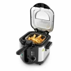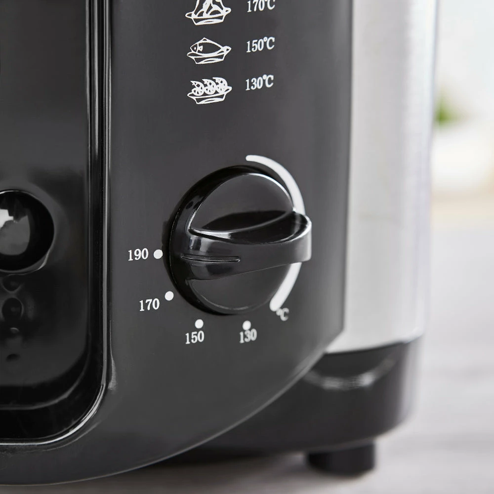 Traditional chip shop-style food is made easy using this 2L Deep Fat Fryer. It delivers accurate results with its adjustable thermostat, allowing you to control the temperature to cook your ingredients to perfection every time. The generously-sized frying basket is great for cooking classic homemade chips, crispy chicken, battered fish or delicious doughnuts. Its large viewing window lets you easily monitor your food as it cooks, while the folding handle and lifting system allow you to lift the basket out of the oil without needing to open the lid for safer handling. Removable parts and the non-stick enamel oil pot make it quick and easy to clean off grease and food residue after use. A built-in carbon filter ensures unpleasant cooking smells aren’t left lingering around, keeping your kitchen fresh and odour-free after frying.