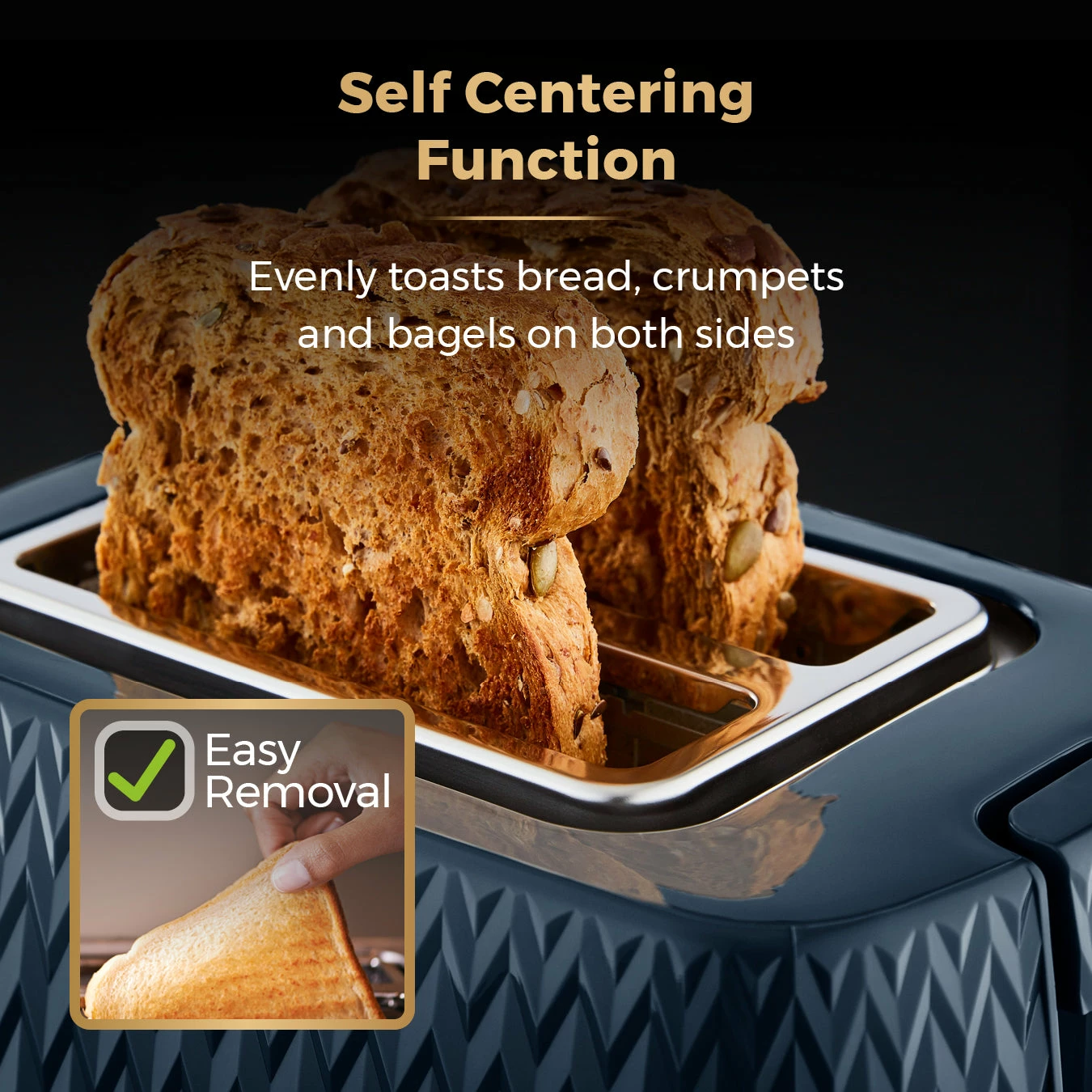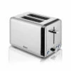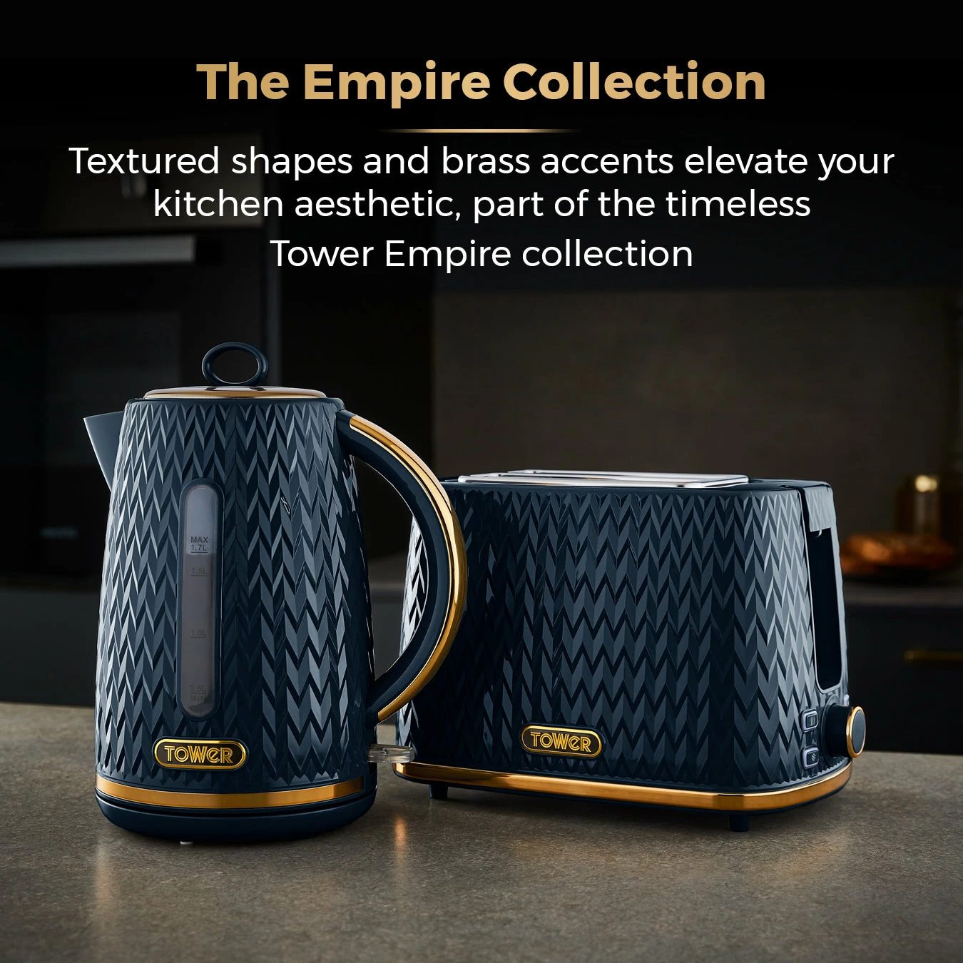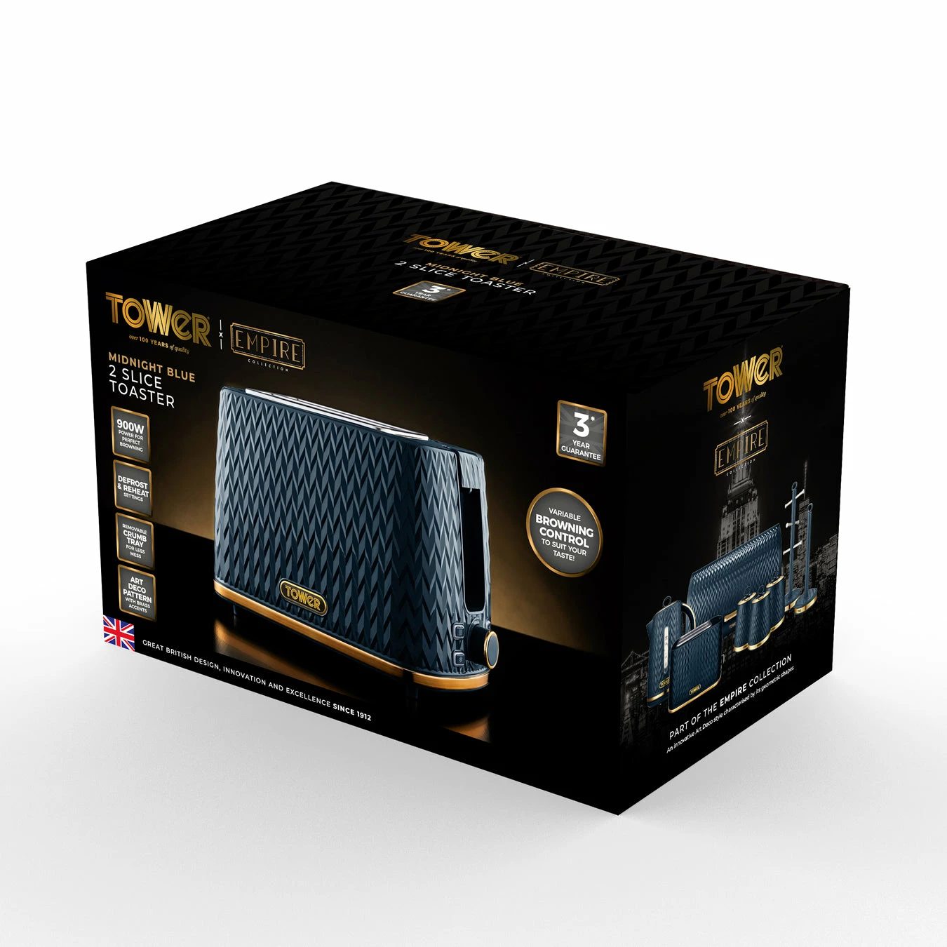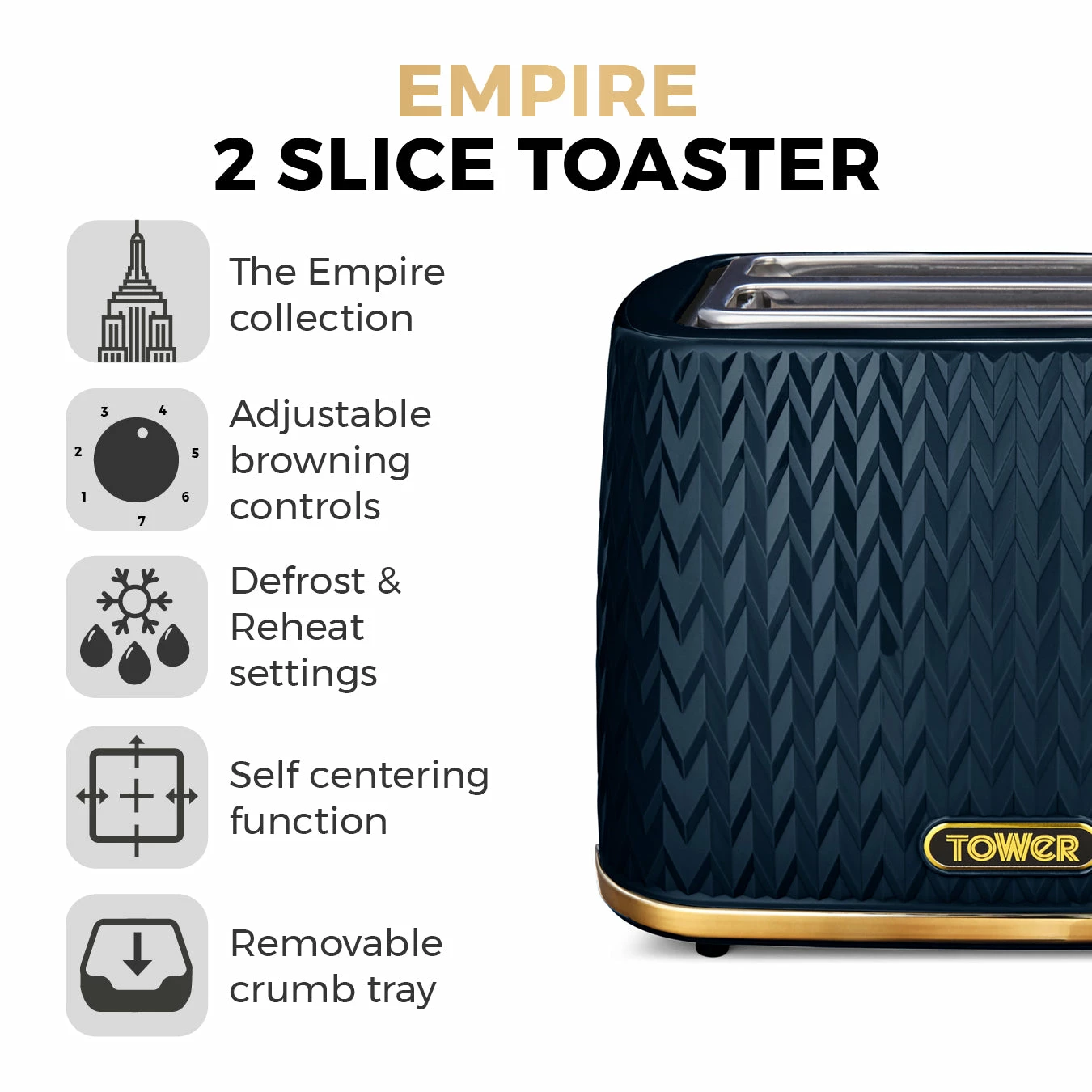 Start your morning off with the delicious smell of toast, crumpets or muffins using this Empire patterned black coated 2-slice toaster with bronze accents. The 2 toasting slots provide enough space for various sized loaves; while the adjustable browning control’s 7 different settings lets you select your ideal browning consistency for delicious results. The self-centring function provides even coverage across each slice during toasting. The defrost and reheat options provide complete control over the toasting cycle, with an anti-jam function and an automatic turn off function for safe operation. The removable crumb tray and integrated cord storage provide easy cleaning and neat storage after use.