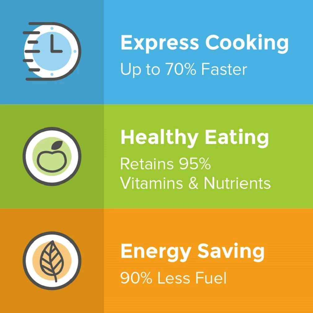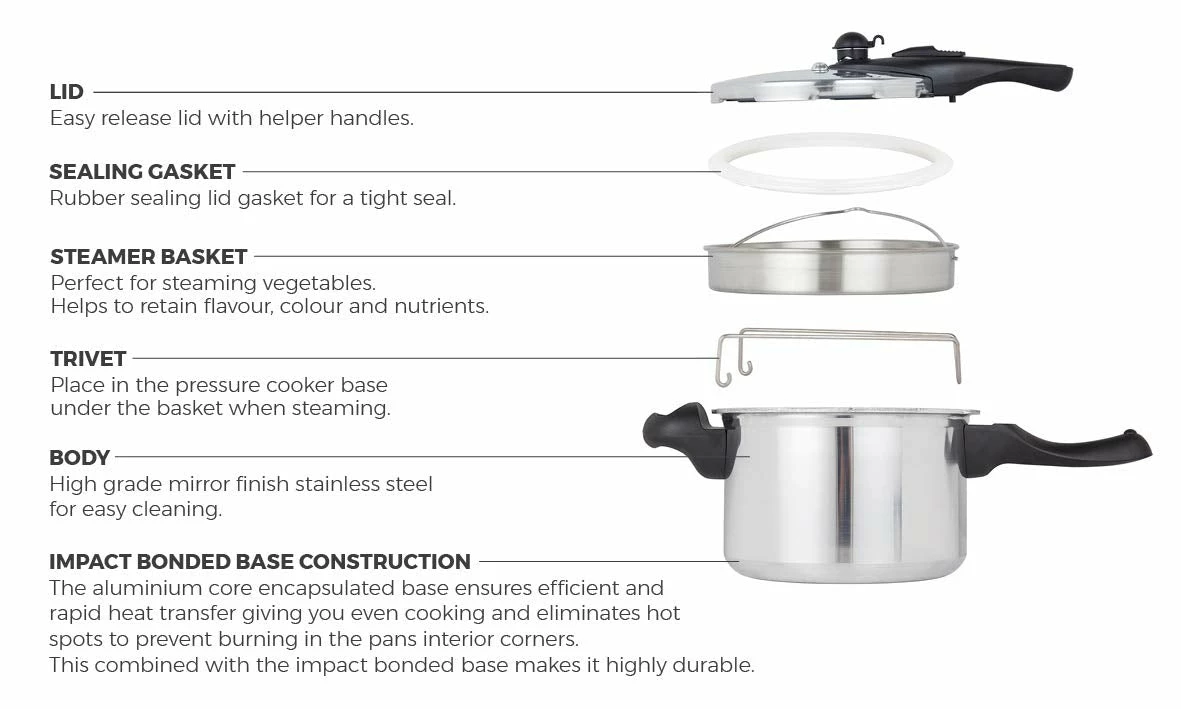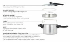 Delicious, healthy meals are made easier with Tower’s Hi Dome Pressure Cooker. Its bonded steel base heats up quickly to cook food in a fraction of the time a traditional oven takes, retaining meat’s juicy, succulent textures and the full flavour of fresh vegetables. Food cooked in the pressure cooker preserves a higher percentage of its nutrients and vitamins when compared to conventional methods. With a large 6 litre capacity and spacious high dome design providing plenty of portions to feed a house of hungry guests, this pressure cooker is ideal for cooking healthy, hearty meals for all of your friends and family. It features ergonomic phenolic handles which ensure safe and comfortable use, complete with steamer basket and rack accessories to expand your cooking options. The Hi Dome pressure cooker is compatible with all hob types including induction, boasting an easy-clean aluminium body to make short work of the washing up.