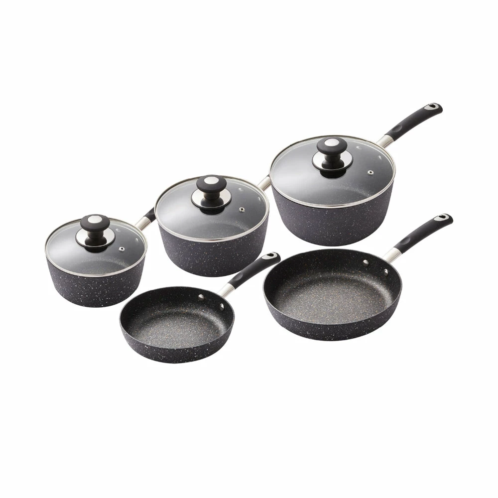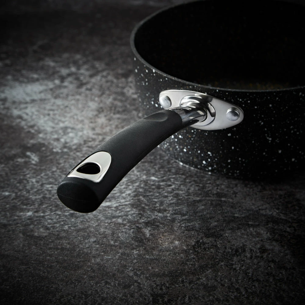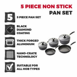 The Tower Precision 5 piece pan set has everything a contemporary kitchen needs to give people a reason to get cooking. This set includes 16/20/22cm saucepans and 20cm/28cm fry pans, each featuring an ultra-durable stone non-stick coating that’s 7 times stronger than standard non-stick coatings. The pans have a thick forged 3mm aluminium body for faster heat distribution for more efficient results. The riveted steel handles provide ultimate comfort and control when serving out portions of food. This set is suitable for all hob types and is dishwasher safe, making quick work of the washing up. It’s the ultimate collection that every kitchen needs.