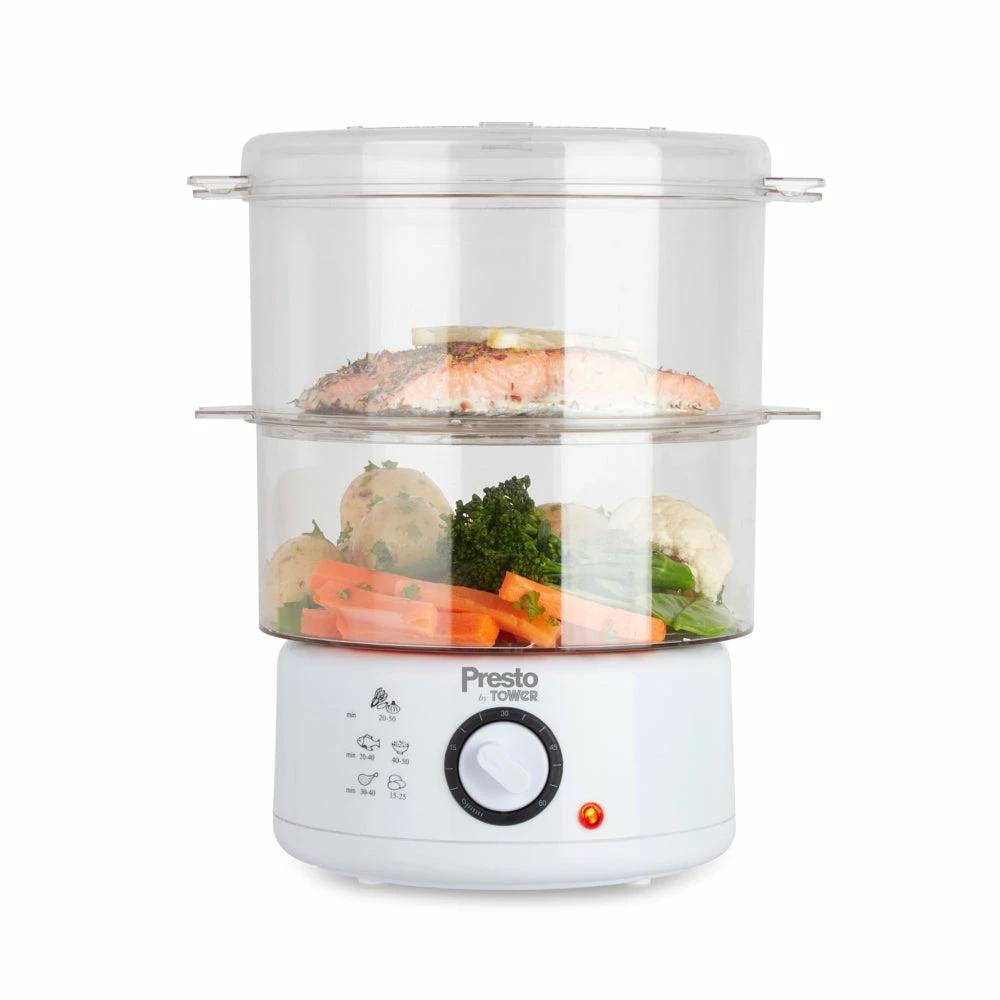 Create quick and healthy meals with this Presto 2 Tier Steamer from Tower. It features 2 x 2.4 litre tiers which are perfect for steaming portions of fish, meat and vegetables, with 400W steam-ventilated performance to lock in more vitamins and nutrients from your ingredients. The 60-minute timer provides complete control over the cook time, allowing you to schedule an end time to ensure precise results. An extendable stand offers additional space to cook more ingredients, while the included rice bowl accessory is ideal for preparing the perfect fluffy rice for your dishes. Dishwasher-safe parts provide an easy clean, with collapsible containers to save that extra bit of space in storage. The steamer has non-slip rubber feet for enhanced stability on your surfaces, complete with an automatic switch-off feature to ensure safe use.