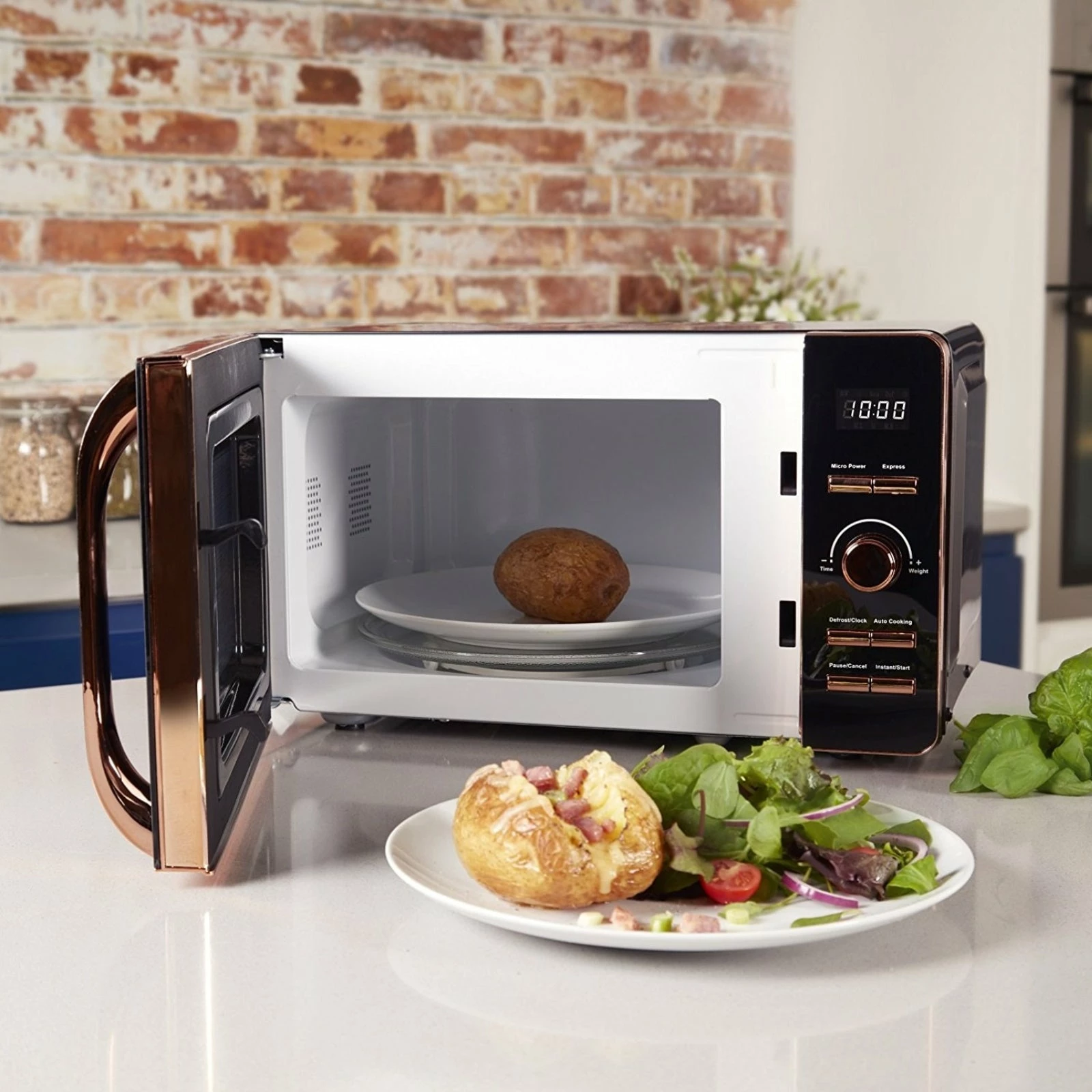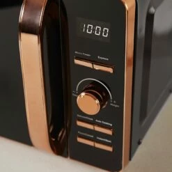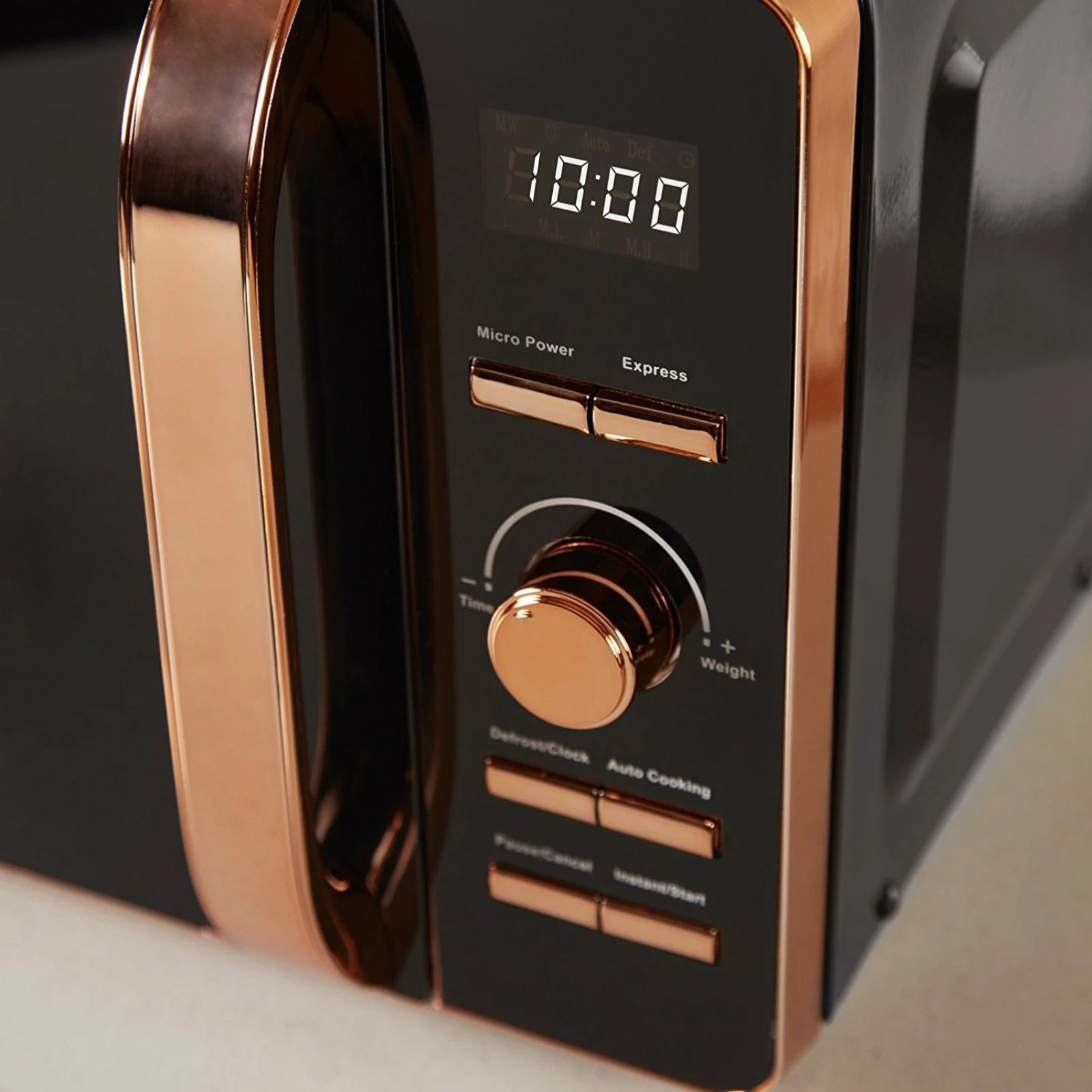 Packed with functionality surrounding elegant rose gold accents, this 800W black 20 litre digital microwave is the perfect tool for convenient cooking. It features 8 autocook settings, including milk/coffee, rice, spaghetti, potatoes, auto-reheat, fish, popcorn and pizzas so you can make your favourite meals at the touch of a button. It also includes 6 power levels so you can heat up everything from ready meals to casseroles in a matter of minutes and defrost function. Comes with Tower’s 3 year warranty.