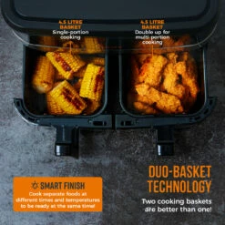 Exclusive to Tower Air Fryers, Vortx technology rapidly circulates hot air around food. Cooking up to 30% faster than a conventional oven and using 99% less oil, allowing you to save up to 50% on your energy. The Dual Drawer Air Fryer boasts two baskets to provide the ultimate in air frying versatility. Giving you the freedom to cook single portions or larger portions, as required.You can cook separate meals simultaneously in the two 4.5L drawers with a combined capacity of 9L, enough to feed 8 people at once. The Smart Finish control will adjust cook times automatically, so that both baskets finish cooking at the same time. You can also choose from 10 one-touch pre-sets to take the guess work out of cooking.